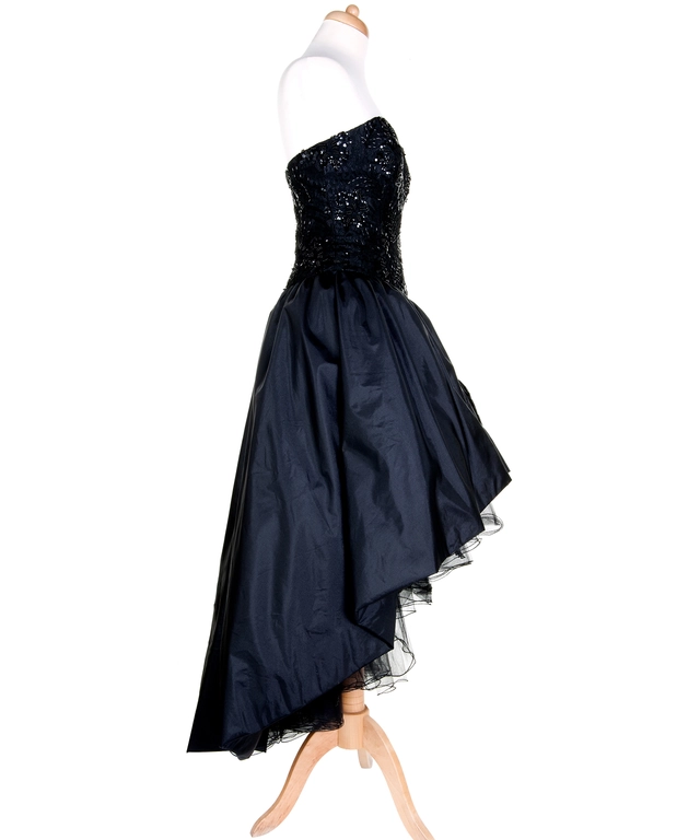 Deze betoverende cocktailjurk uit de jaren 60 is een waar pronkstuk voor elke vintage liefhebber. De jurk heeft een elegant strapless lijfje met een hartvormige halslijn, prachtig afgewerkt met zwarte pailletten en kraaltjes op kant over taft. De schittering geeft het geheel een luxe uitstraling, perfect voor een feestelijke of formele gelegenheid.
