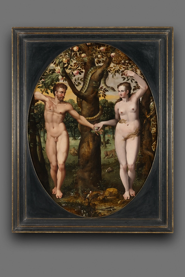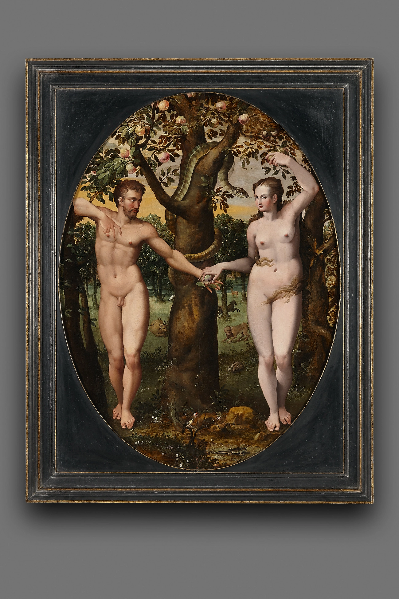 Deze grote voorstelling van de zondeval is geschilderd in de zestiende eeuw en toont ons het bepalende moment waarop het kwaad op aarde terecht komt. Adam staat links van de boom en Eva rechts. Zij geeft een appel aan Adam en plukt er nog een voor haarzelf. De slang kronkelt ondertussen om de stam van de boom en lispelt in Eva’s oor. Op de voor- en achtergrond wordt ons een blik in de Hof van Eden, het paradijs, gegund waarin diverse dieren door een parkachtig landschap lopen. Het fraaie vogeltje en de hagedis op de voorgrond zorgen voor een sterke dieptewerking in het schilderij.