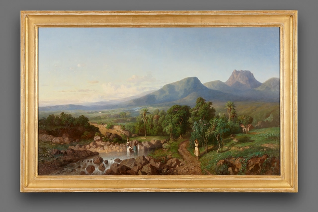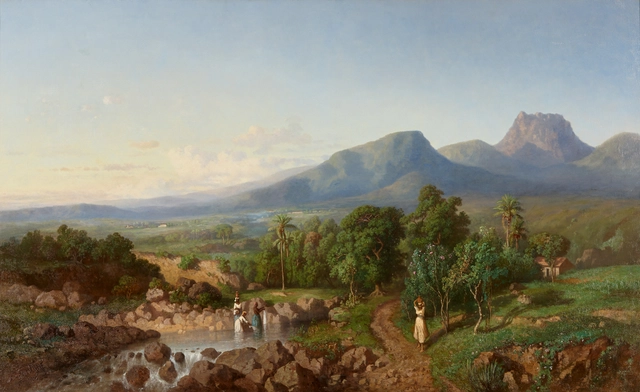 Dit panoramische landschap toont ons een uitzicht op vulkanen van het eiland Guadeloupe, met op de voorgrond wassende vrouwen in het riviertje de Galion. De grote vulkaan aan de rechter zijde draagt de naam La Soufrière, lokaal liefkozend La Vieille Dame genoemd, en is de enige actieve vulkaan van het eiland. Links daarvoor ligt de meer glooiende vulkaan Néz Cassé. Door de ligging van de rivier en de vulkanen kunnen we zeggen dat het standpunt van de kunstenaar rondom het plaatsje Gourbeyre moet hebben gelegen.
