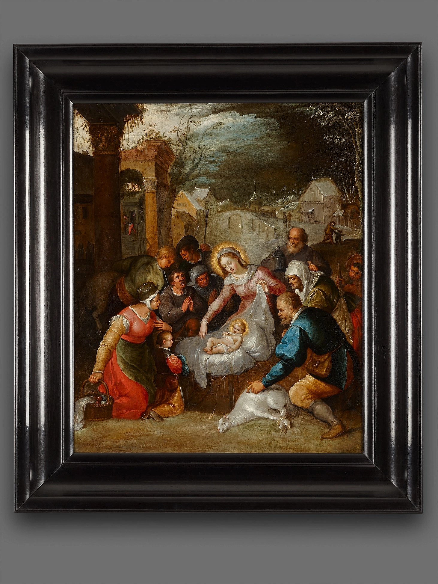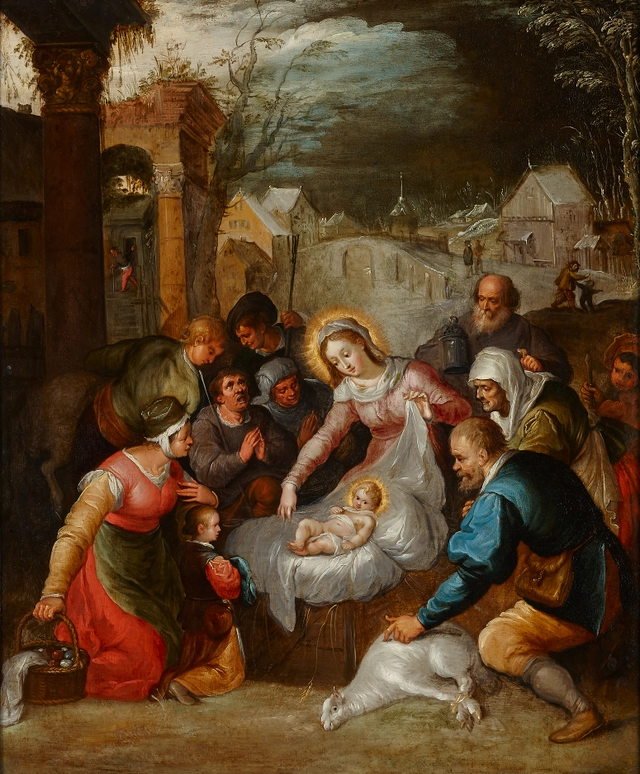 Dit schilderij toont ons één van de scènes rond de geboorte van Christus. Centraal zien we Maria die haar jonggeborene in een ruïne toont aan de toegesnelde herders en dorpelingen, die knielen en bidden bij diens aanblik. Het kindje Jezus ligt in een wit laken in de met stro gevulde kribbe. De achtergrond toont enige bedrijvigheid in Jeruzalem tegen de dagenraad.
