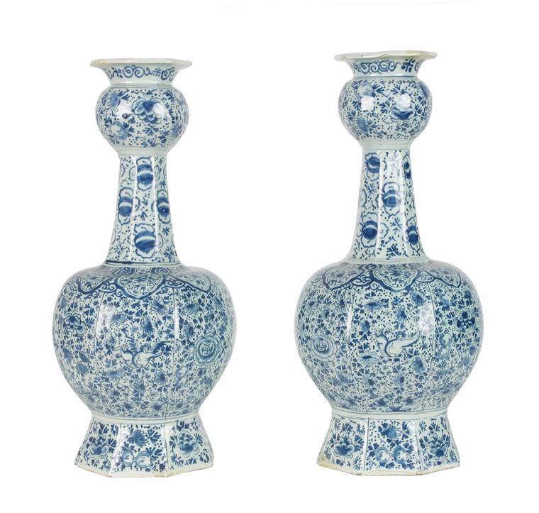 Gemodelleerd met een bolvormige buik en een slanke hals met bovenaan een verdikking. 'Mille-fleurs' motief als decor.