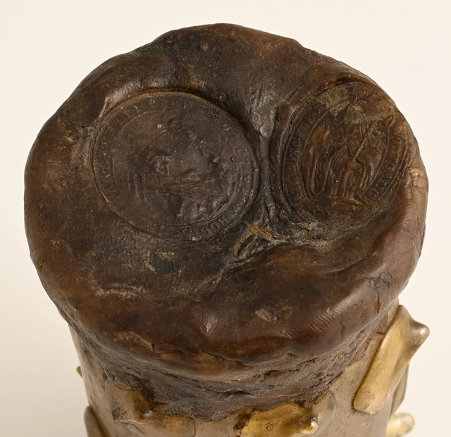 De bovenzijde afgedekt met was, daarop twee stempels.