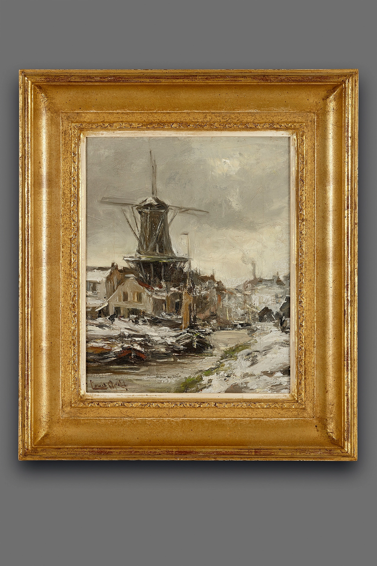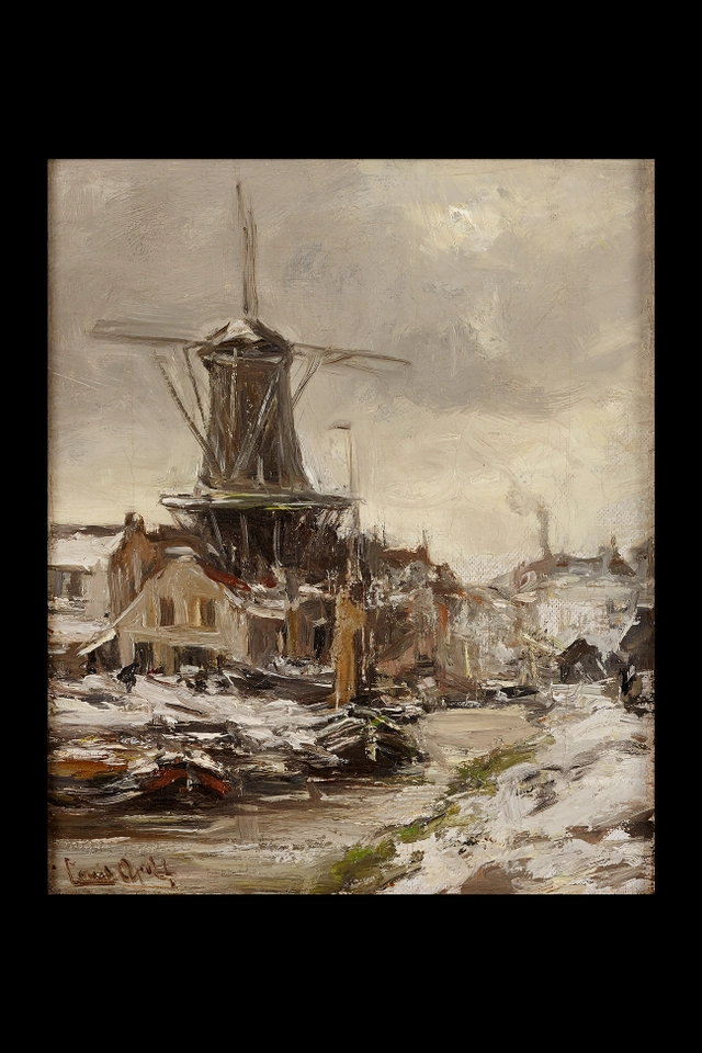 Louis Apol was beroemd vanwege zijn winterscenes. Dit schilderijtje is een zeldzaam klein voorbeeld van zijn kunst. De meeste van zijn schilderijen zijn veel groter.