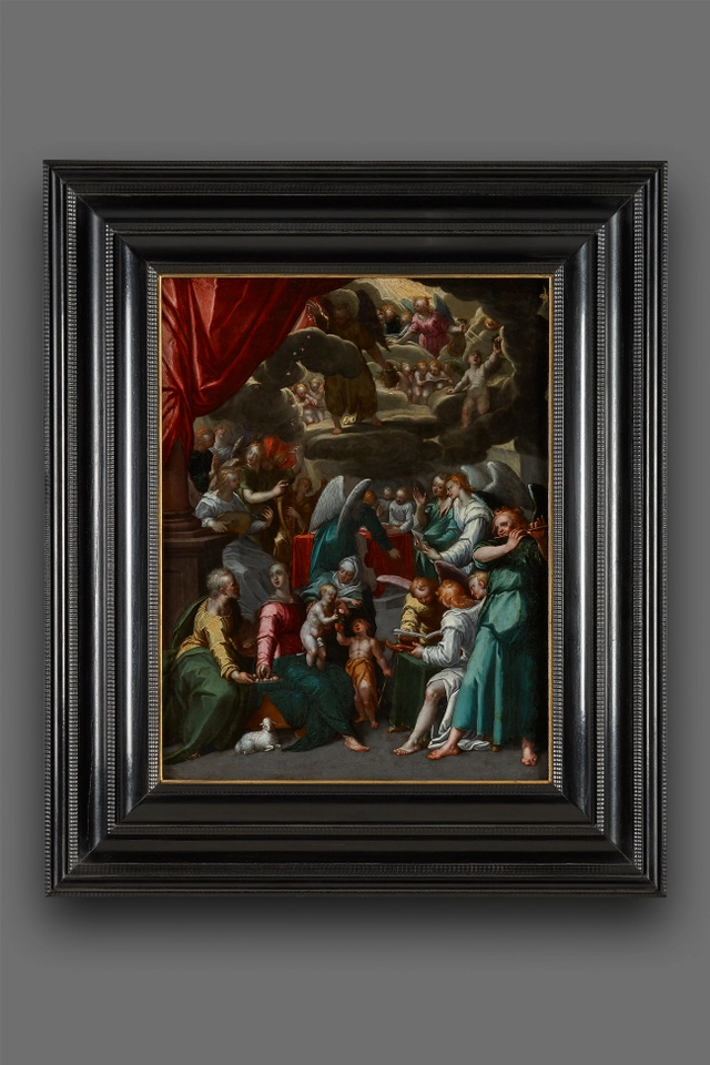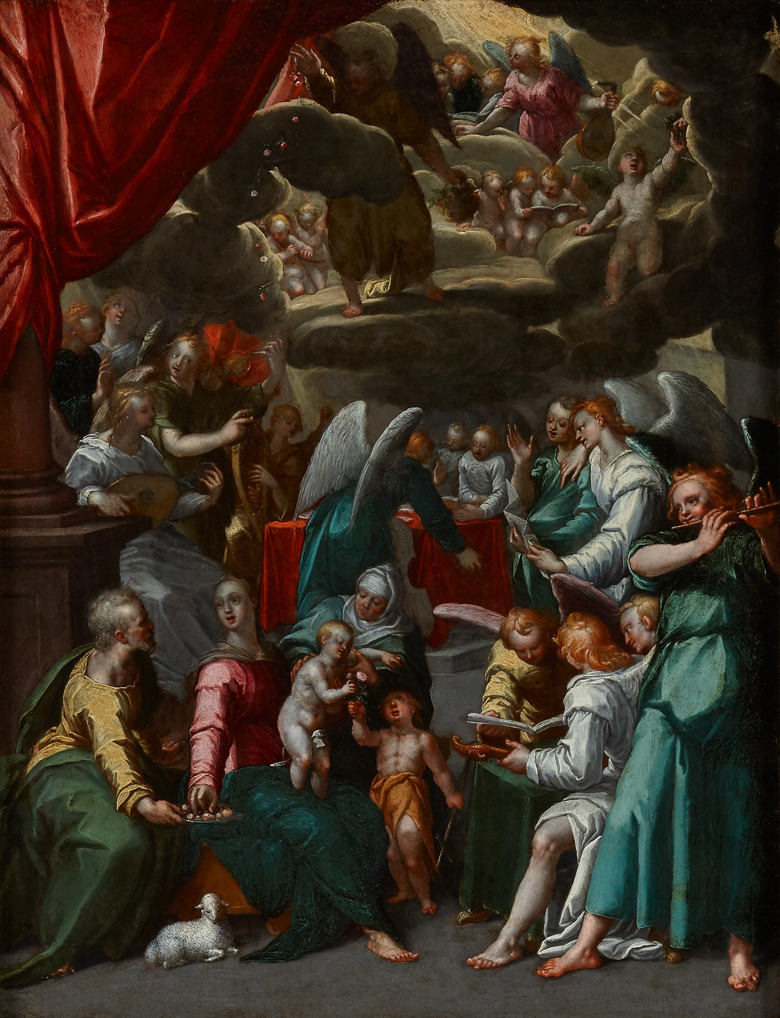 Op deze voorstelling op koper is de heilige familie met Johannes en Elisabeth verbeeld. Zij worden bejubeld door musicerende engelen. Deze engelen staan niet alleen om de heilige familie heen maar verschijnen ook in de wolken. Dit thema in de schilderkunst is weinig verbeeld op klein formaat. Vaak werd het in Italië en later ook in de Nederlanden gebruikt op grote altaarstukken. De engelen zaten dan op aparte luiken aan de zijden. Opmerkelijk is dat vaak als middenpaneel dan niet de heilige familie werd bezongen maar eerder bijvoorbeeld de Maria hemelvaart werd verbeeld.