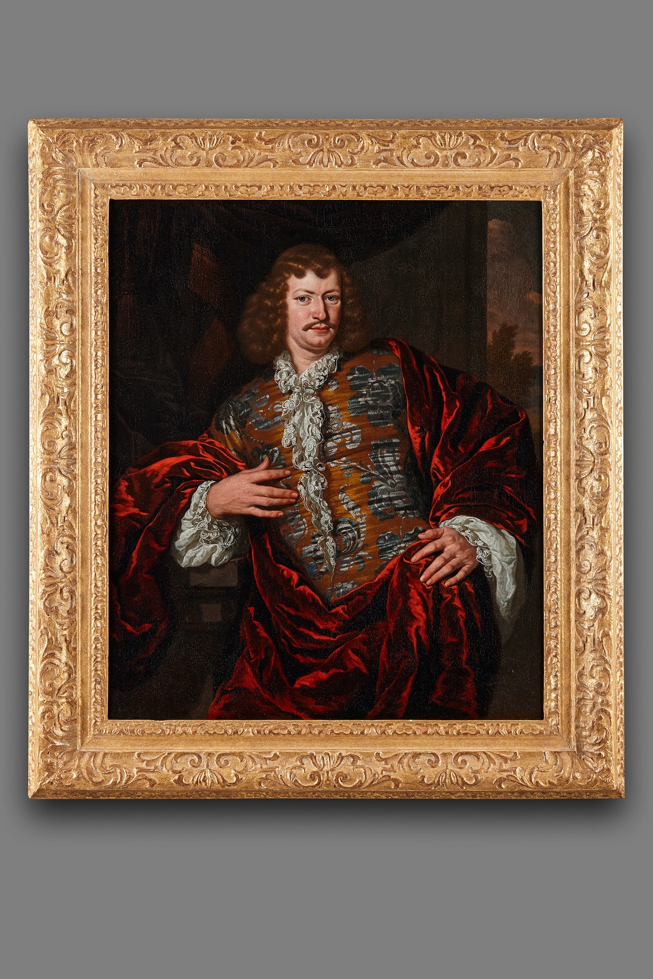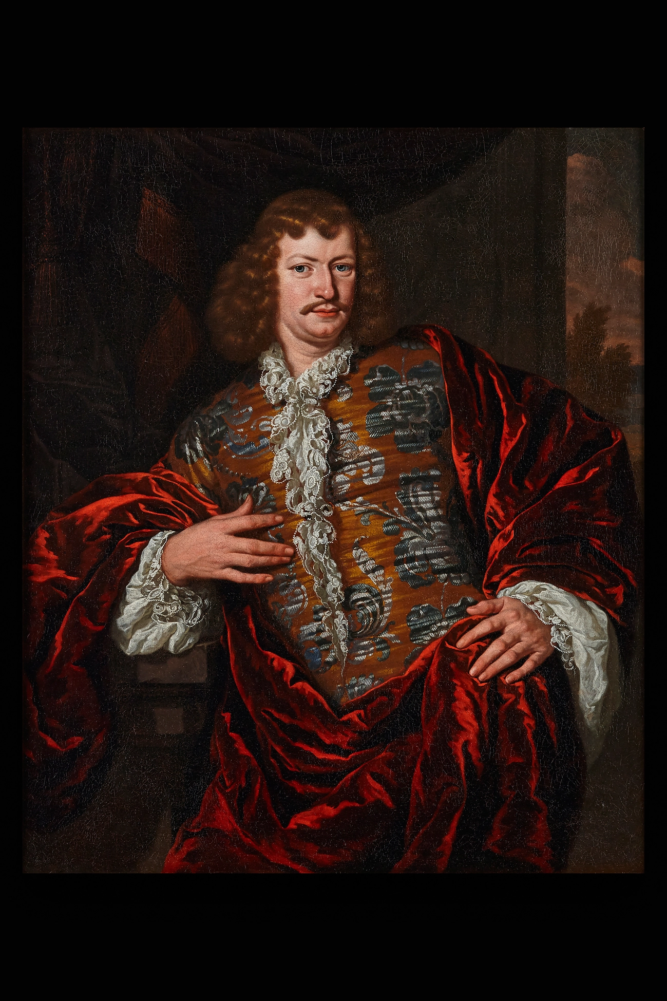 Een man kijkt ons aan. Hij is gekleed in een geborduurd vest met bloemmotieven afgezet met kant en een kanten sjaal. Een rode draperie hangt om zijn schouders en over zijn arm. Dit portret is een typisch voorbeeld van een schilderij uit de succesjaren van Michiel van Musscher.