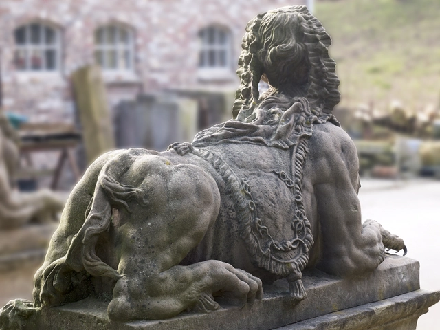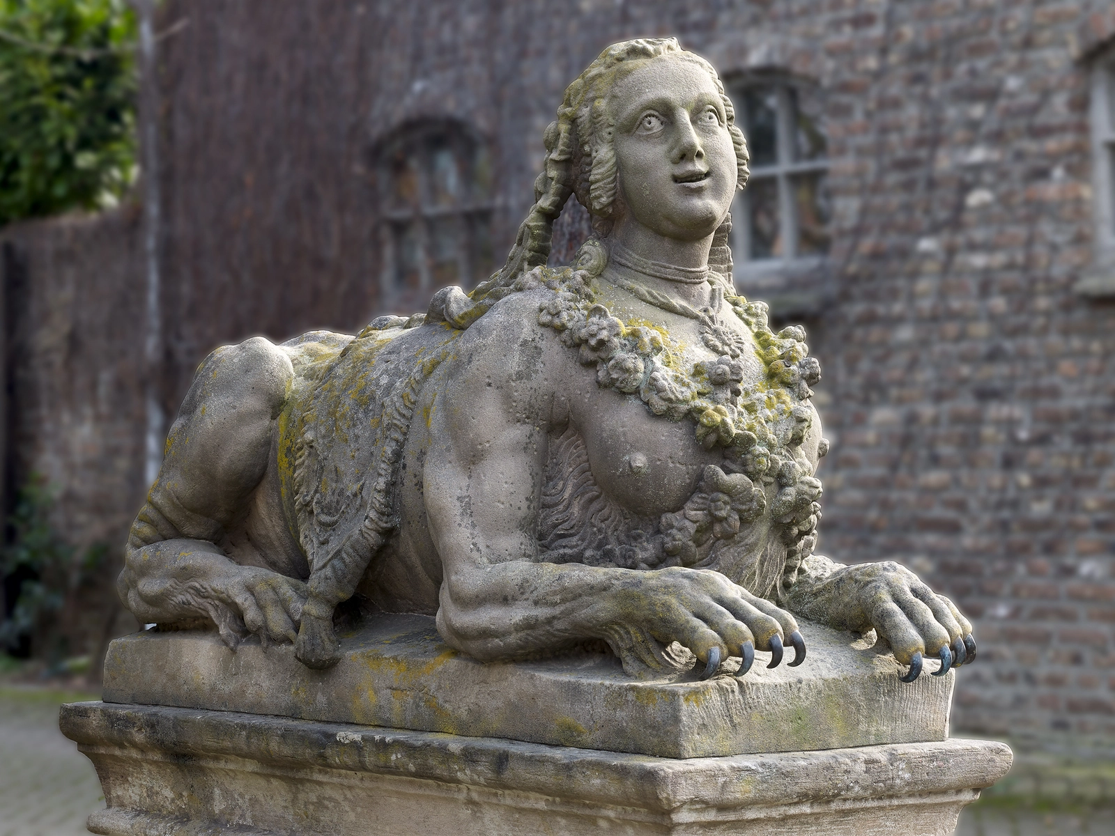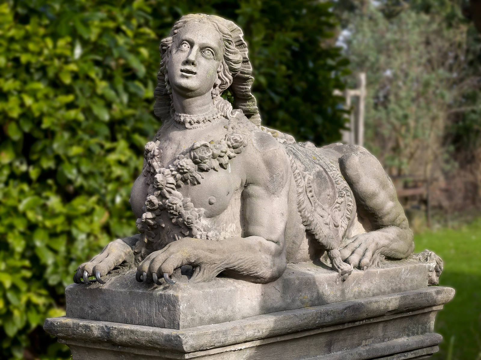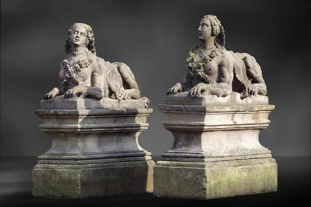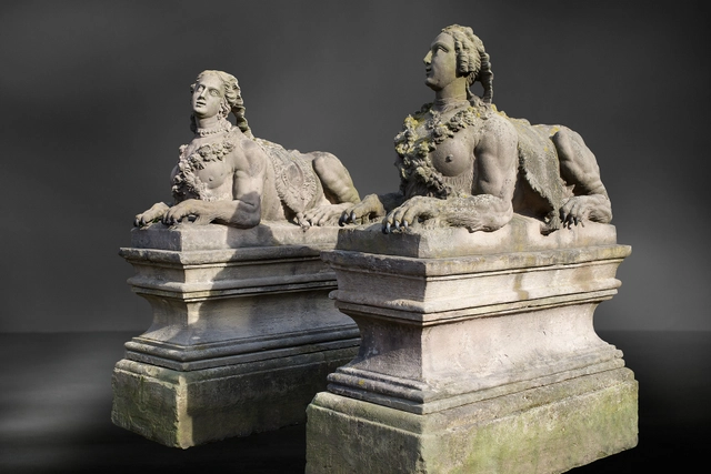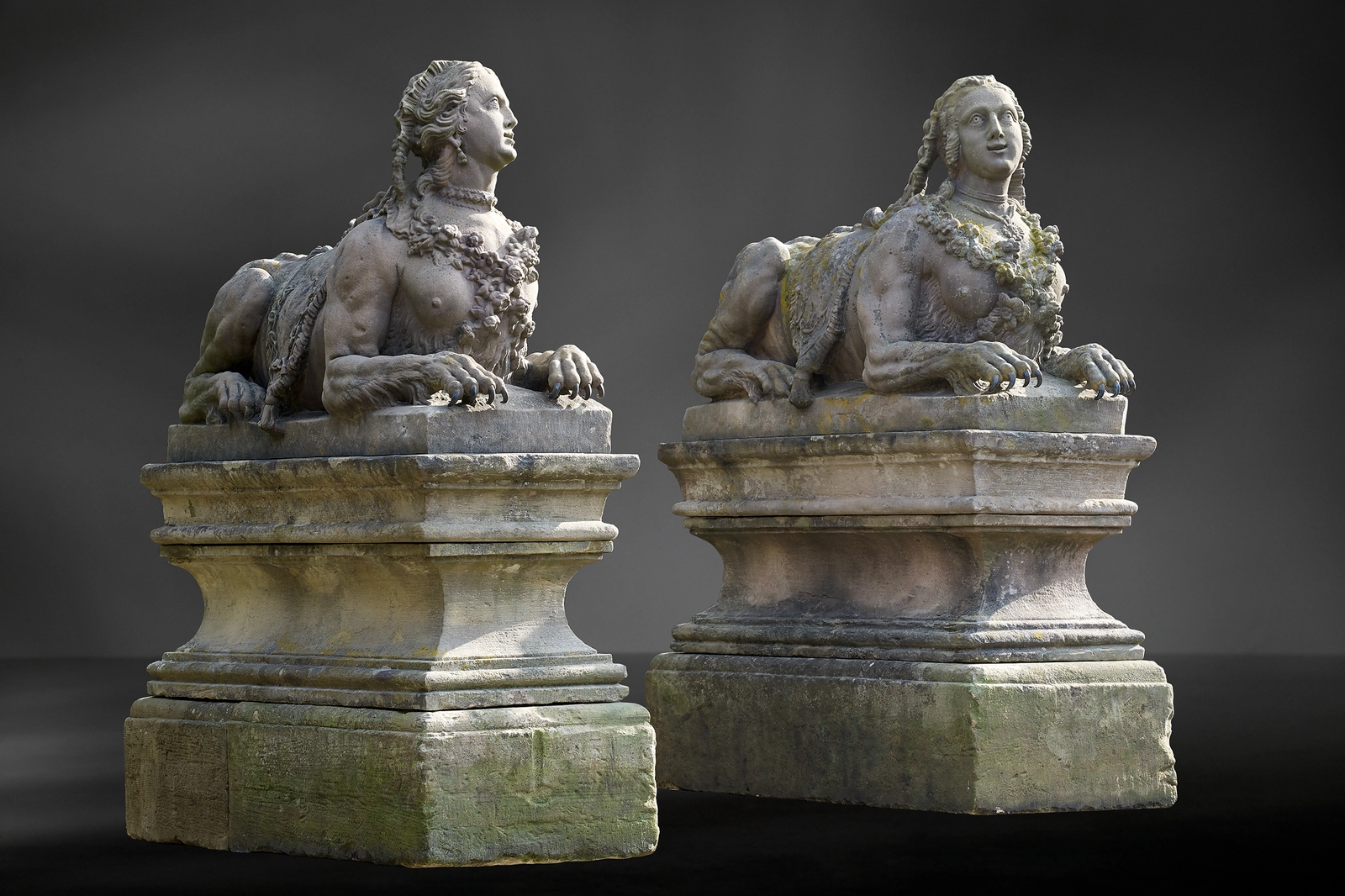 Deze twee duidelijk vrouwelijke creaturen, in het Frans ‘Sphinges’, zijn decoratie-stukken voor de tuin van een onbekend Frans Château geweest. De opdrachtgever was hoogstwaarschijnlijk Royalist, omdat een van de Sfinxen een halsketting draagt met een medaillon met een zon als hommage aan de Zonnekoning.