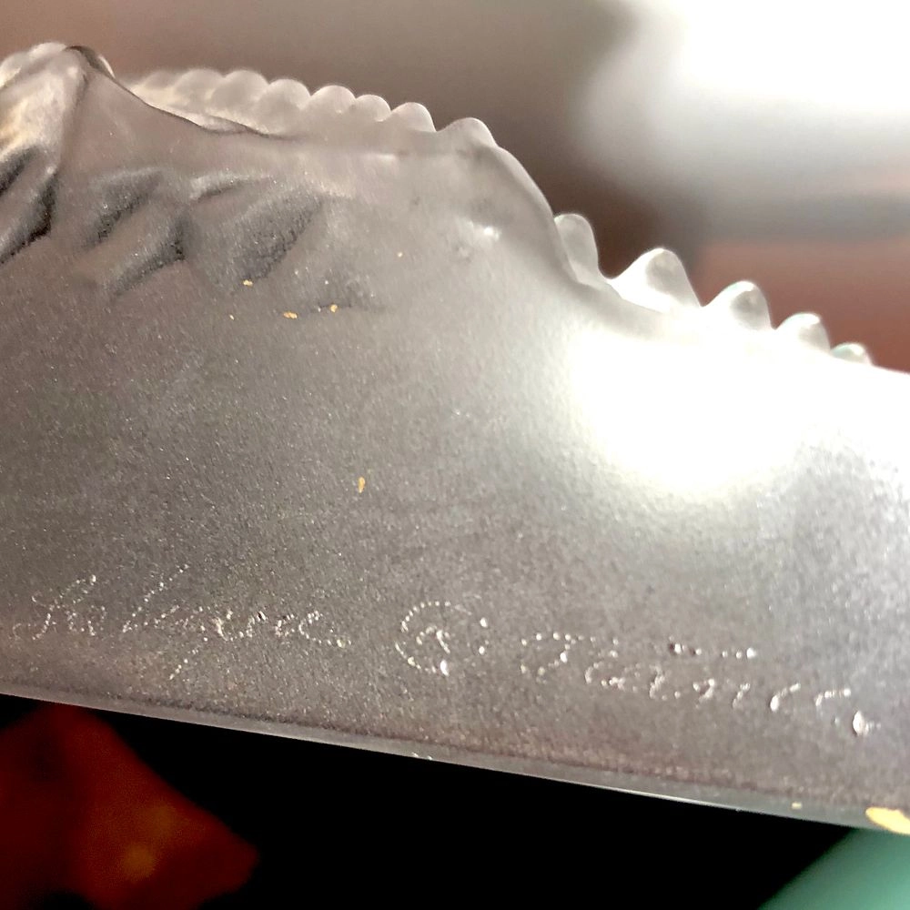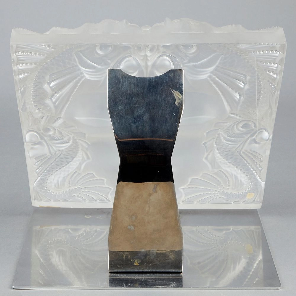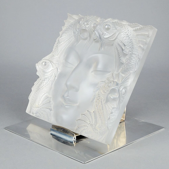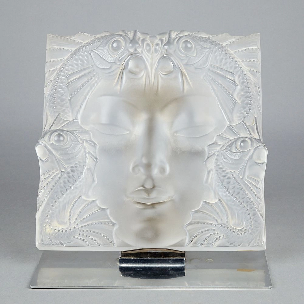 Wall relief ''Masque de Femme N°2'' René Lalique for Coutard, Wingen-sur-Moder, 1935 Colourless glass, moulded, partly cut and polished. Thick, bold relief décor: a woman's face surrounded by four sea creatures. Side in diamond crack inscribed: Lalique France. Side mounting holes from the metal frame. 31.5 x 31.5 cm (without frame). Lit.: F. Marcilhac, René Lalique 1860 - 1945, p. 873, no. 11.