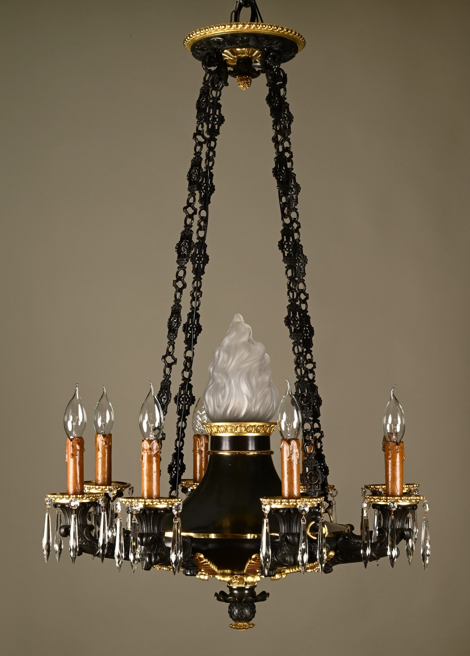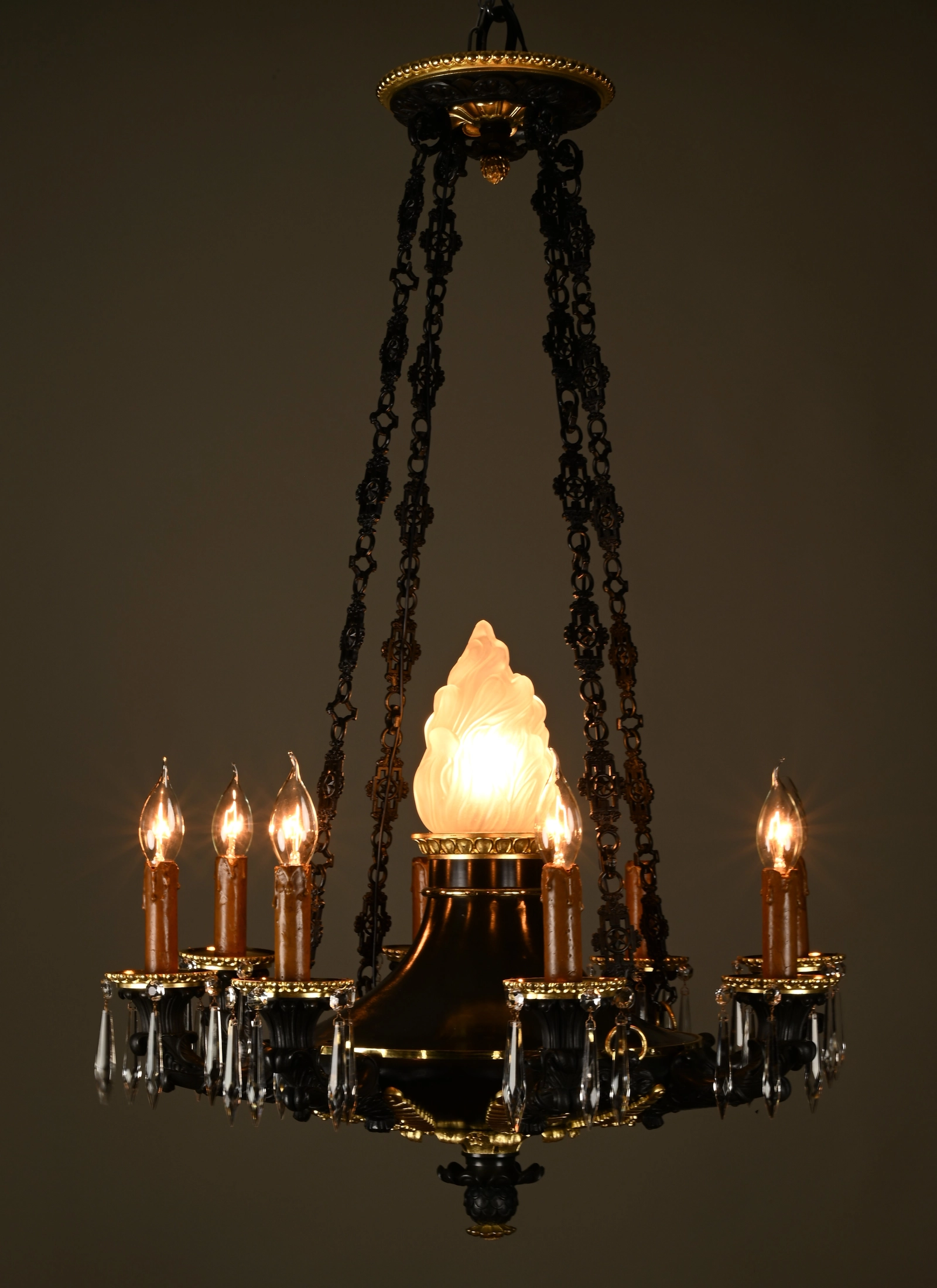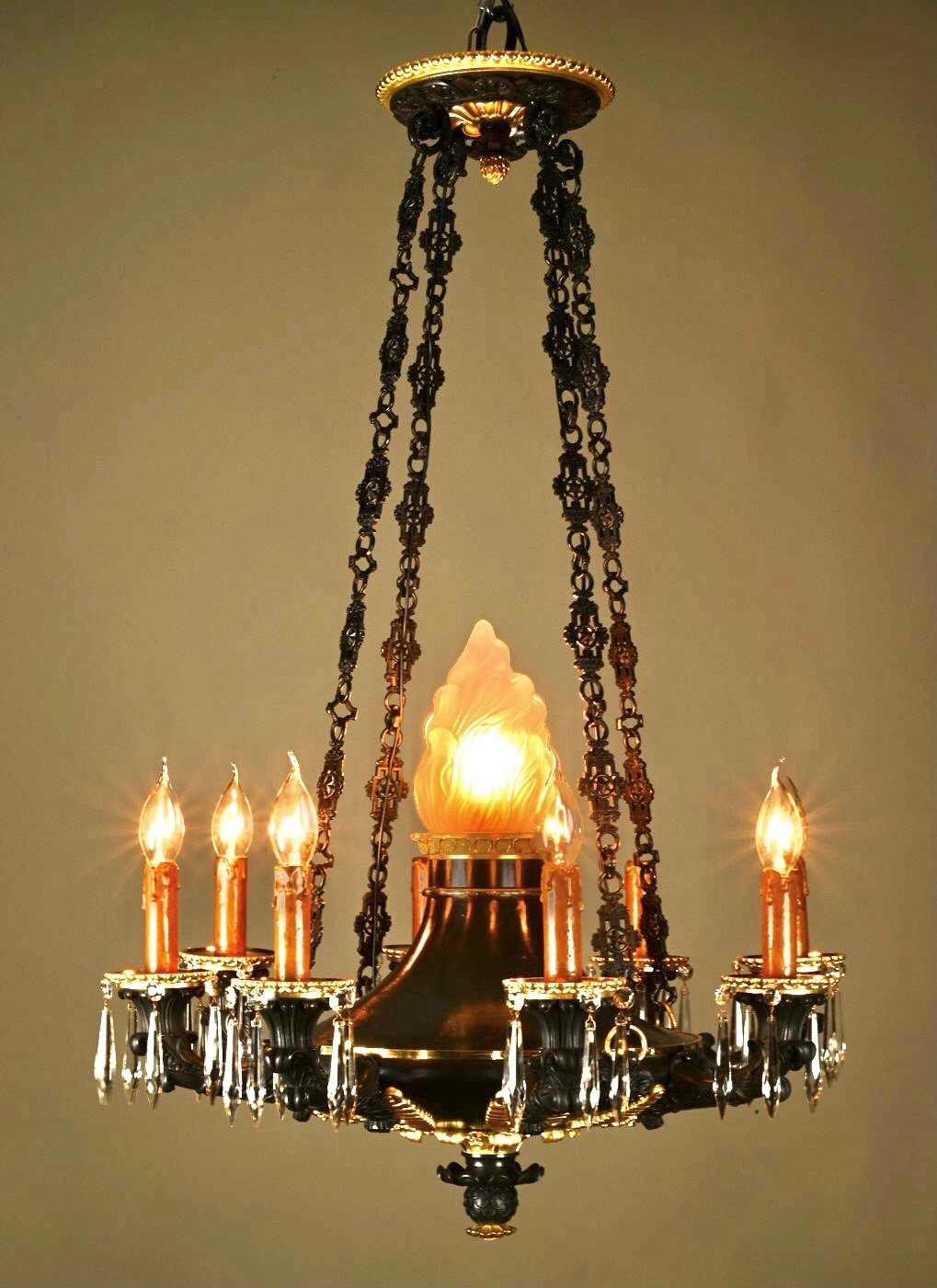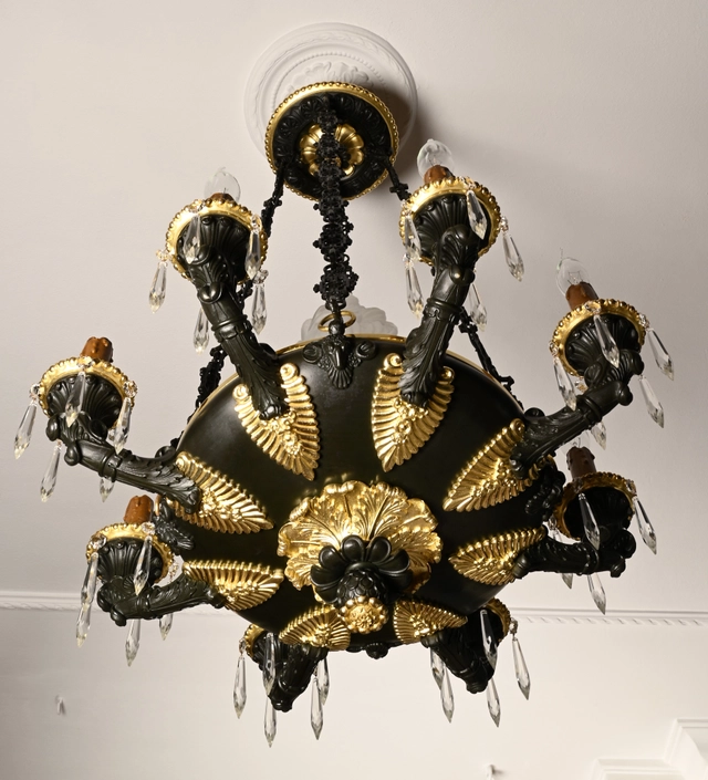 This high quality bronze chandelier has a dark green patination and the original gilding.