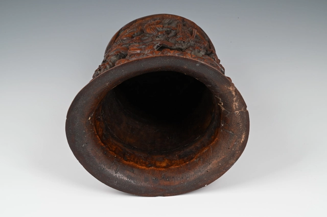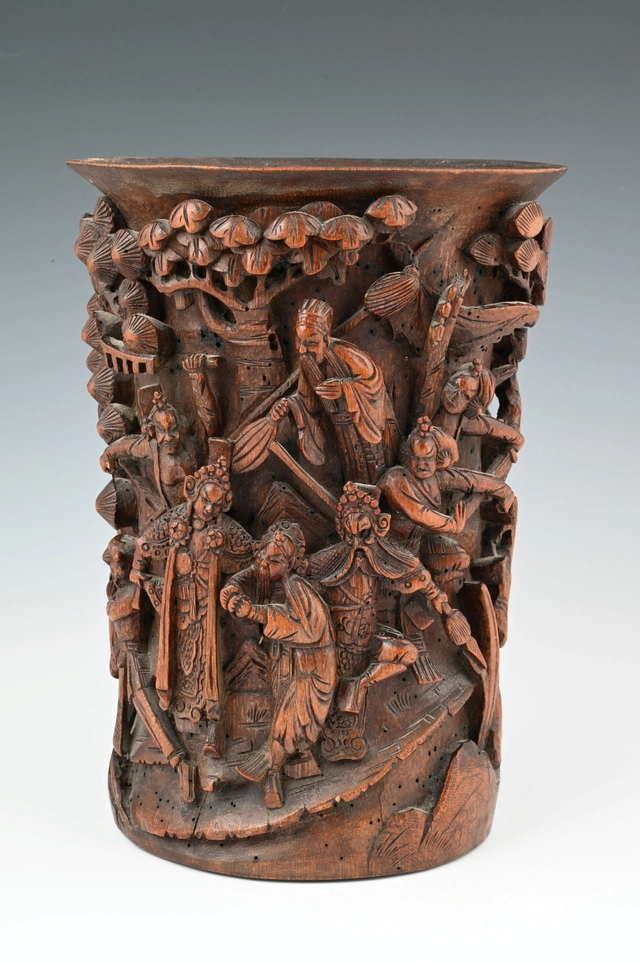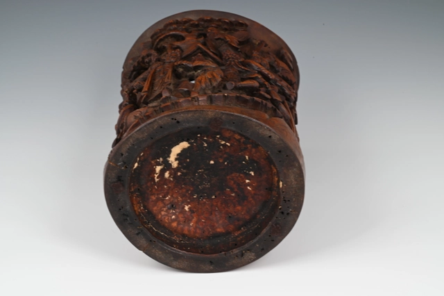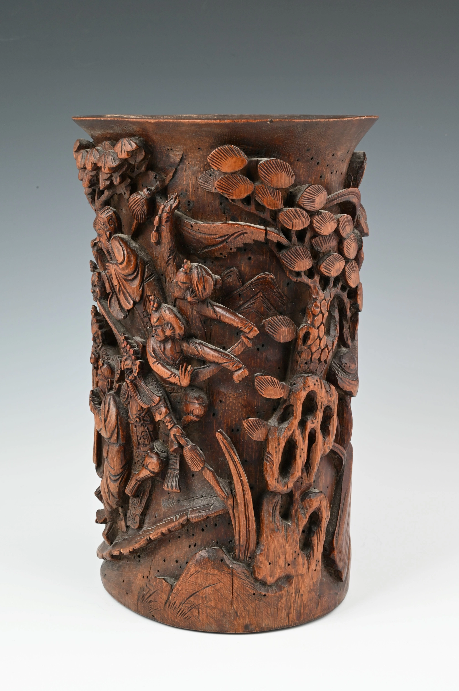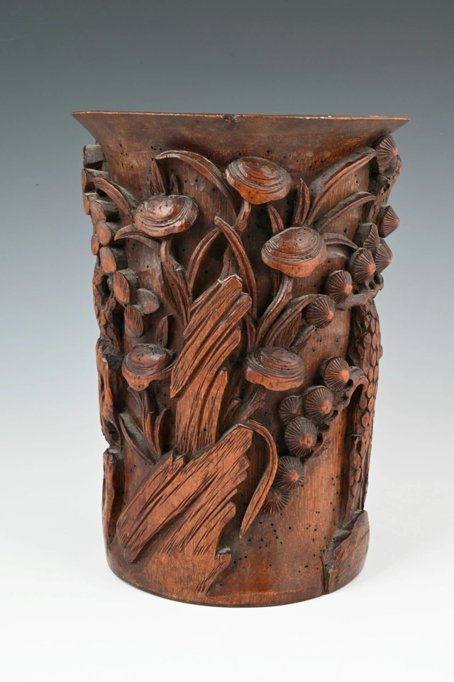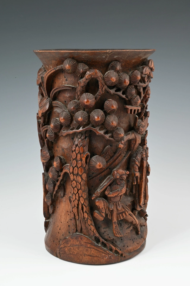 This bamboo brush pot is beautifully deeply carved with floral motifs and figures.