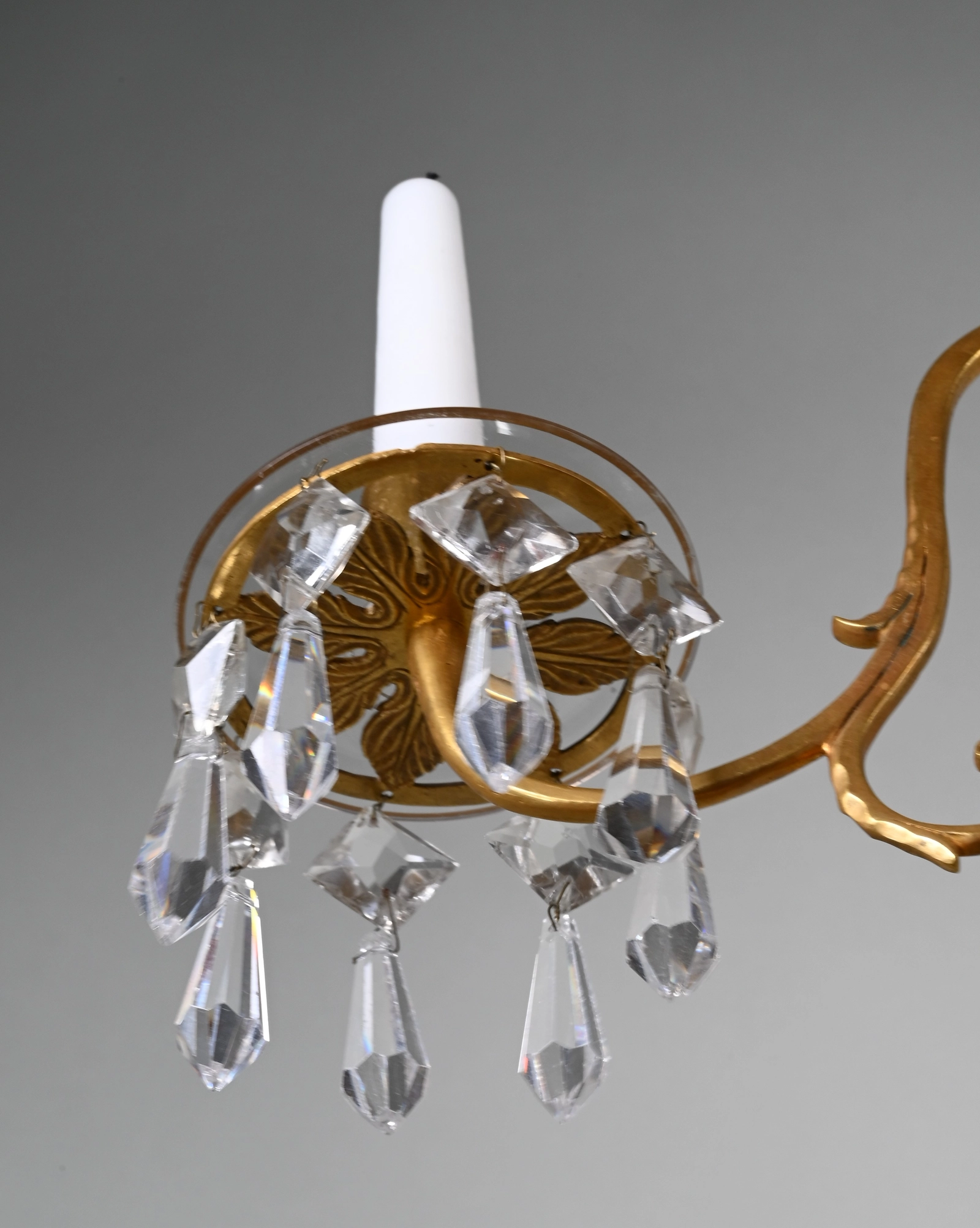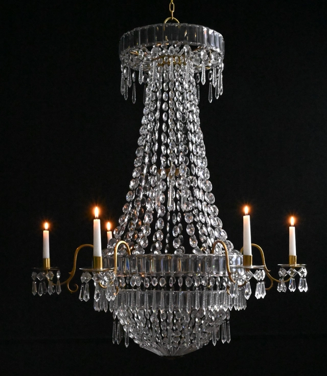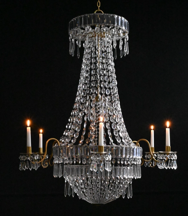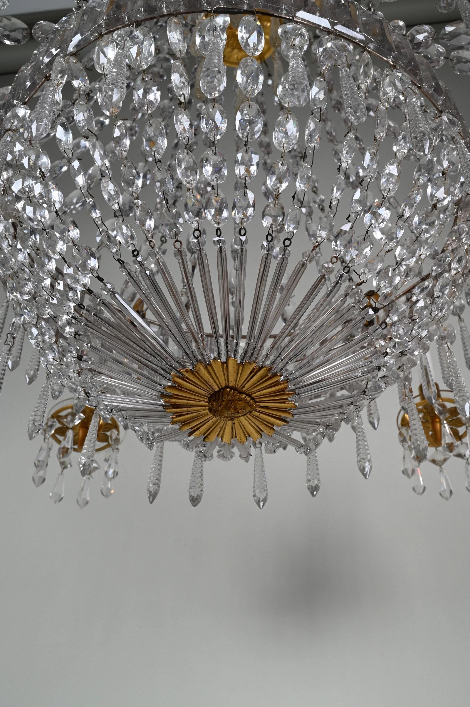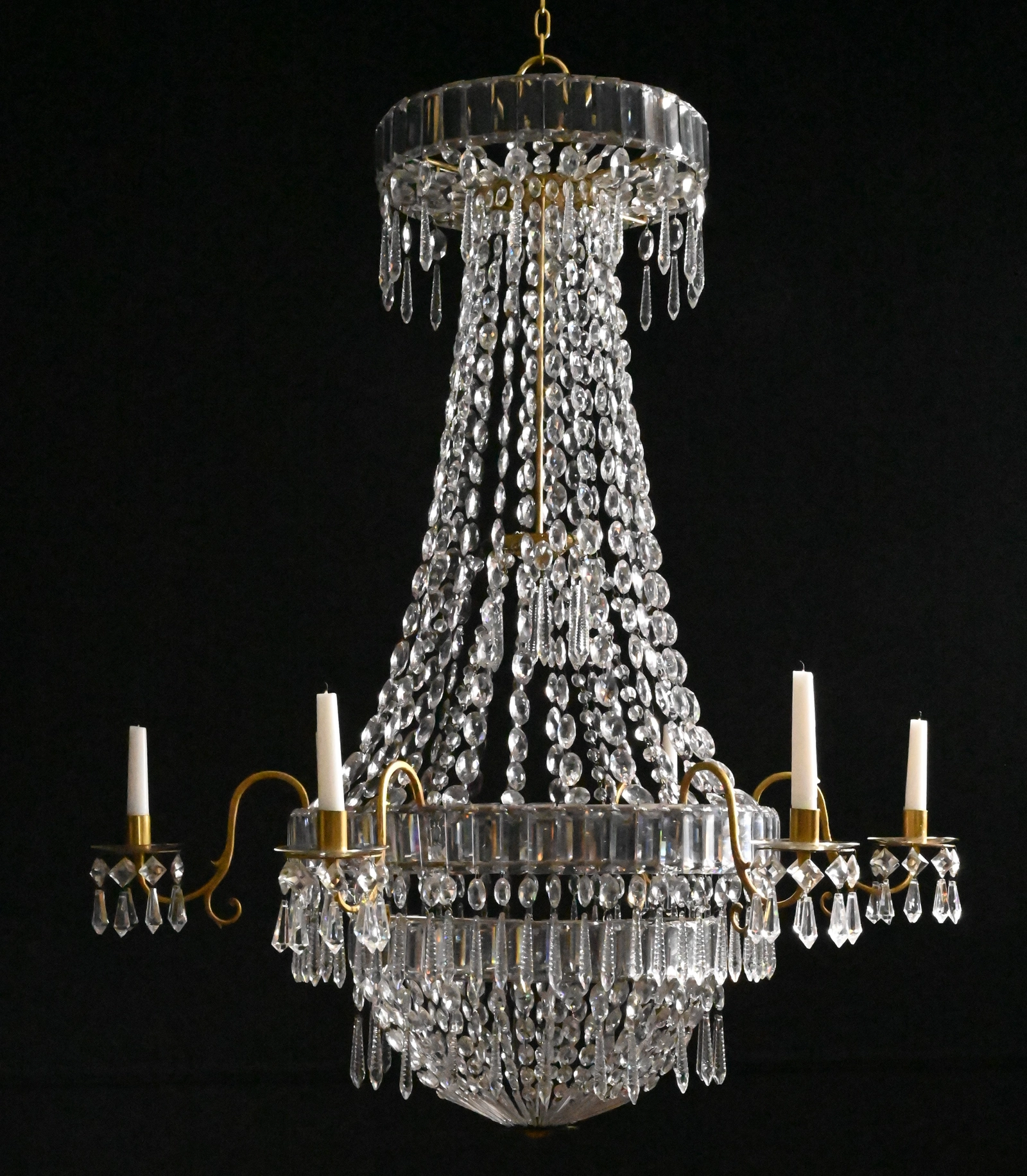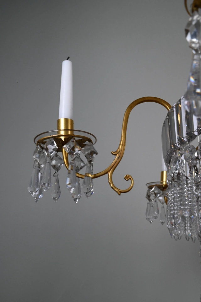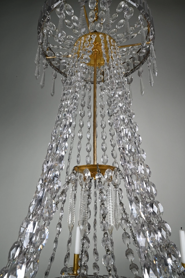 The use of the many crystals and the combination with the ormolu candle arms and ormolu rosette on the bottom makes this a beautiful example from the Louis Seize period.