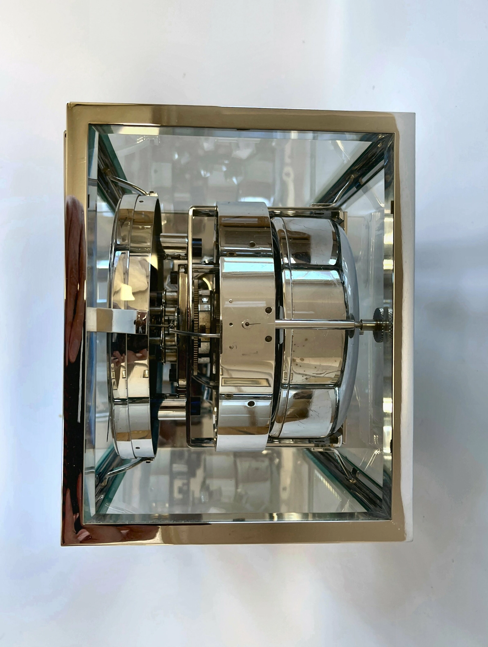 No 4335. Working: The Atmos clock contains a drum with a U-shaped tube containing mercury and a gas. Due to temperature changes a thermique/ thermal current develops in the drum and causes the axle with the U-shaped tube to oscillate to and fro. Because of the continuous changes in temperature and atmospheric pressure there is a continuous oscillation which causes the movement to roll permanently, we have a Pendule Perpétuelle. Original case and movement and in a perfect condition. The invention is the work of the French engineer Jean Leon Reutter. Very exclusive in this Art Deco design. HxWxD 23,5x17,5x14 cm.