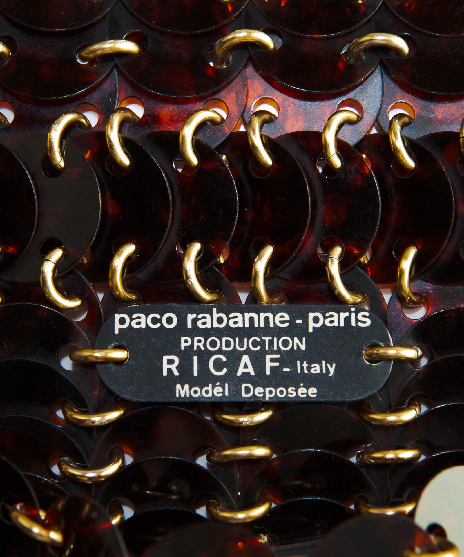 Label, metal tag attached at inside centre back, printed white on black: paco rabanne - paris / PRODUCTION / RICAF - Italy / Modél Deposée