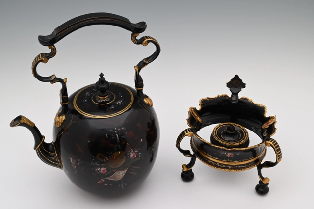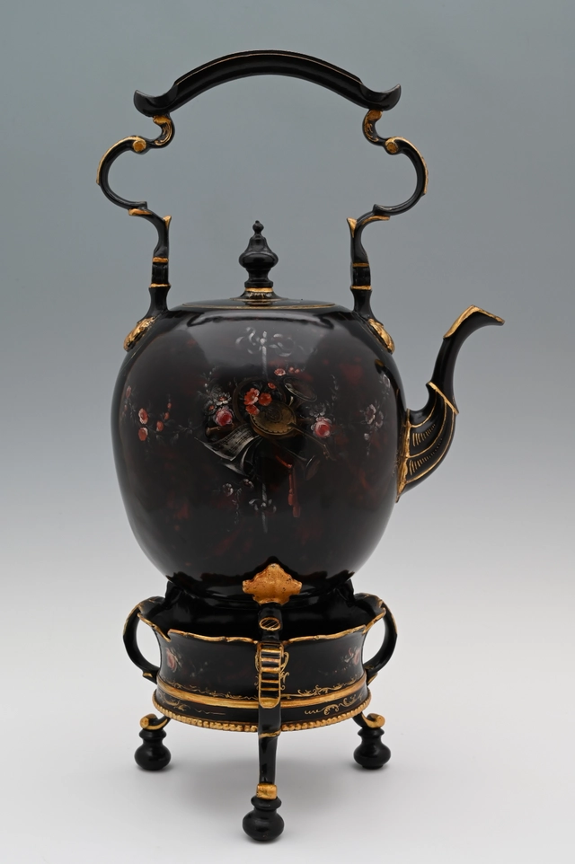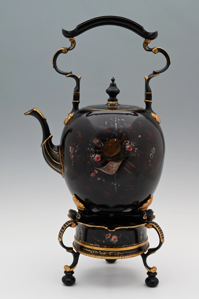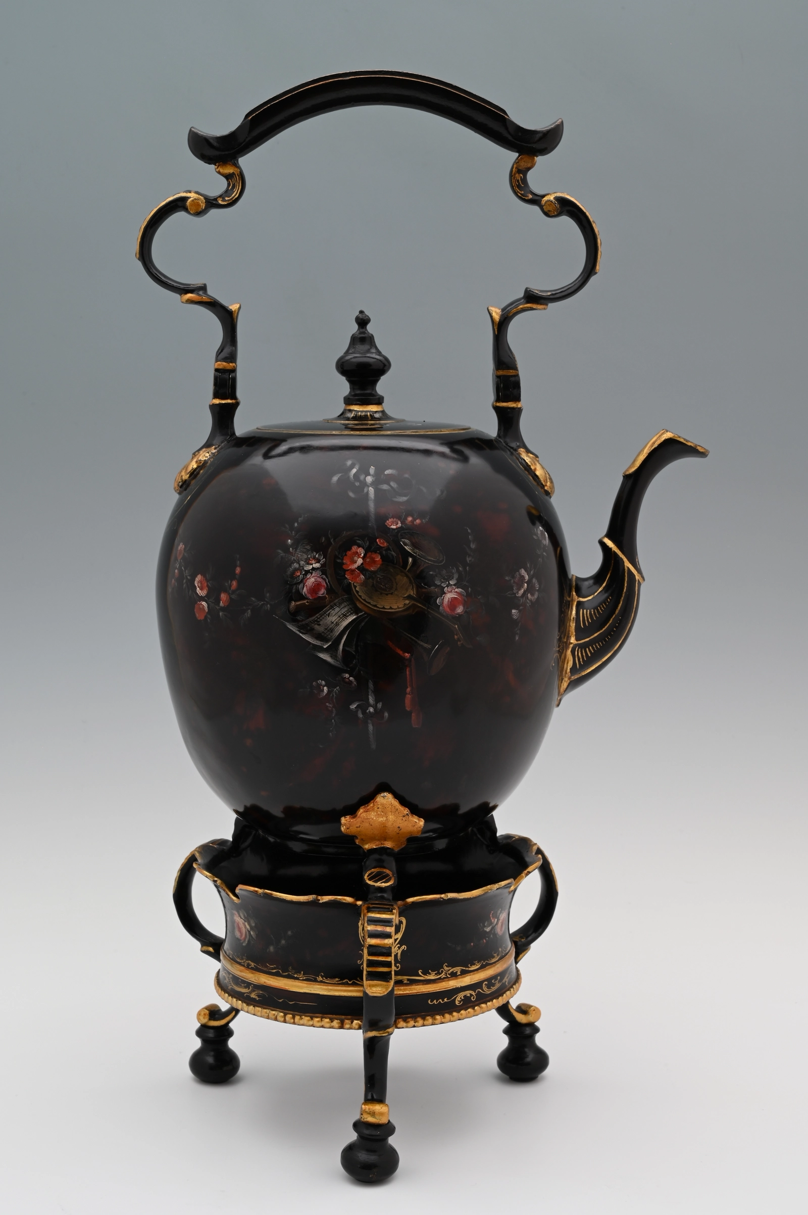 The kettle is painted with imitation tortoiseshell, garlands and in the medallion an illustration of the art of music and painting.