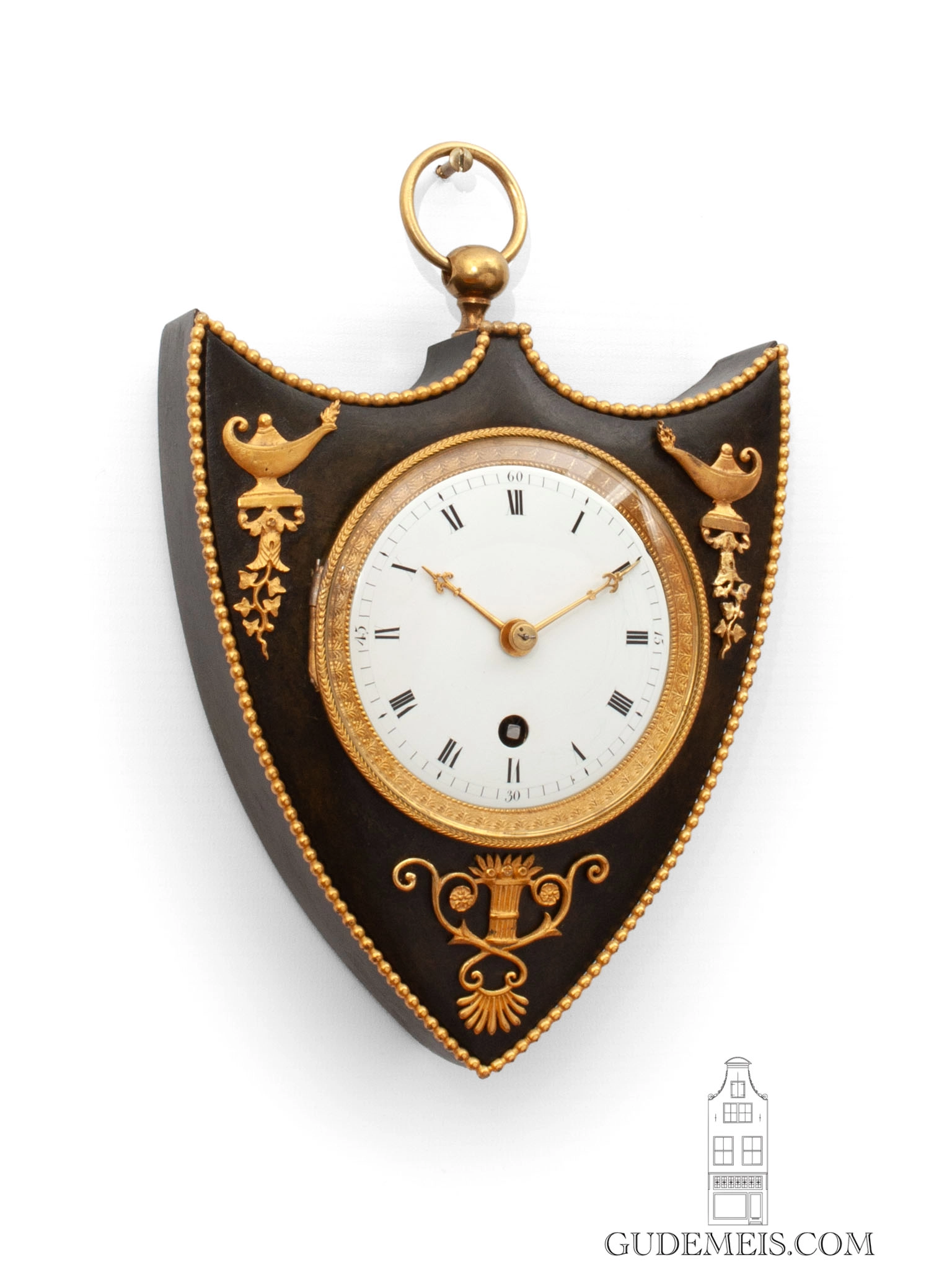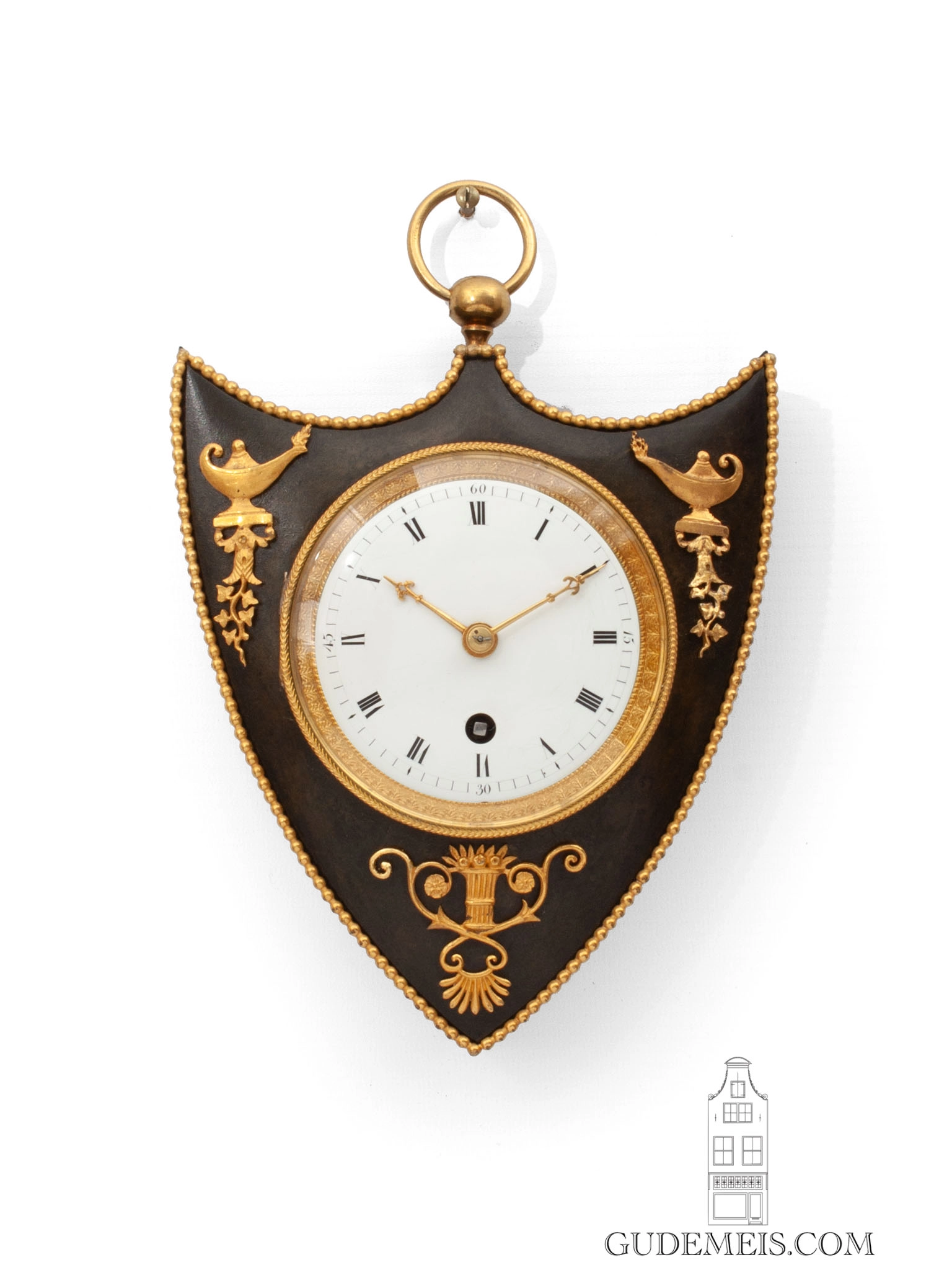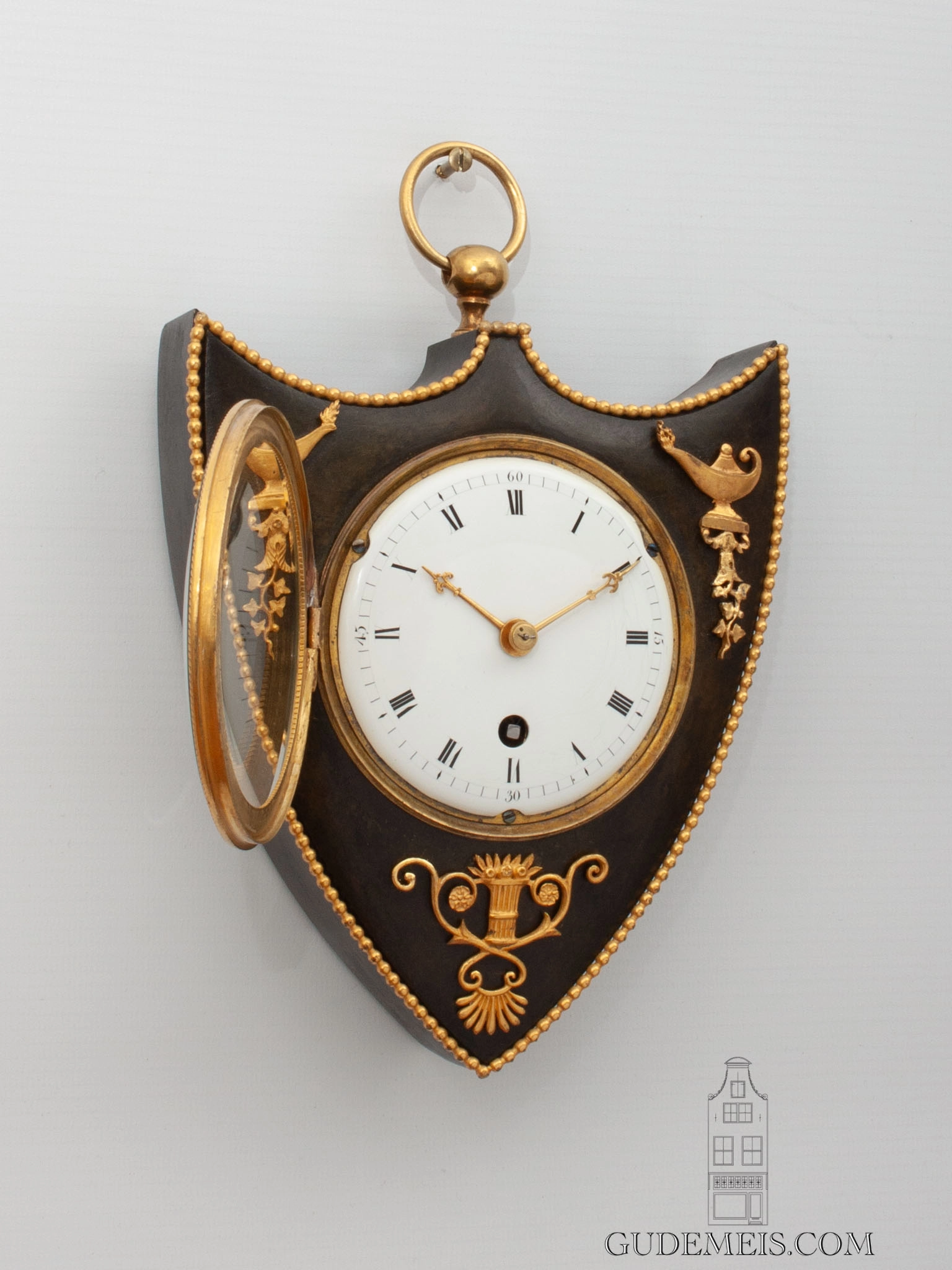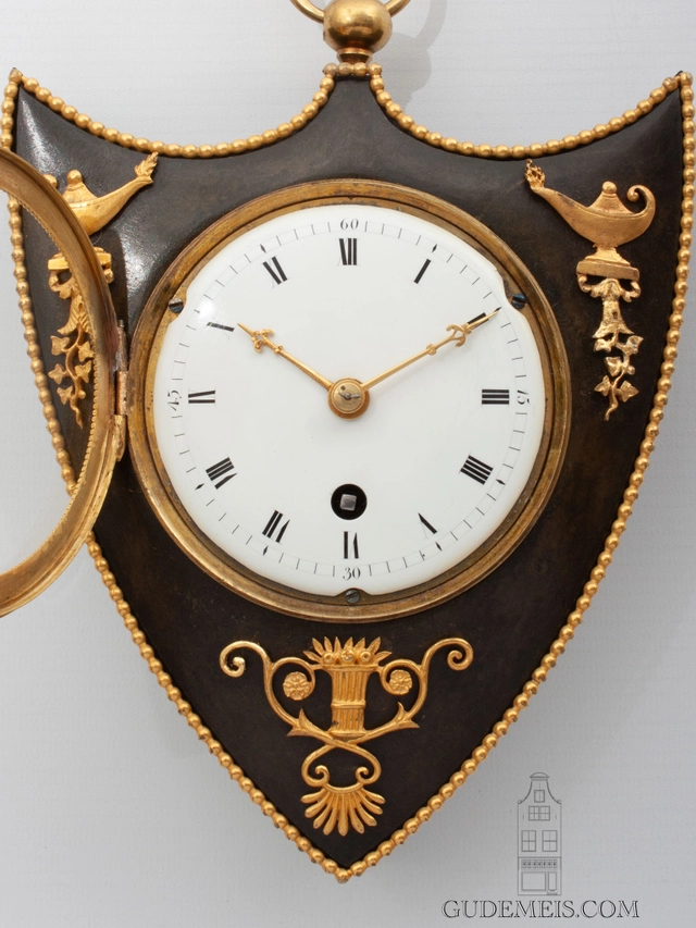 The shield shaped case is made of patinated bronze and is surmounted by a suspension ring. It is lined with a gilt pearl rim and the case itself has classical gilt mounts.