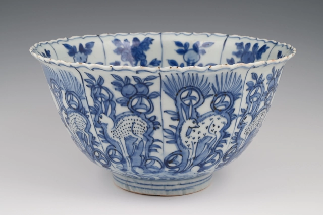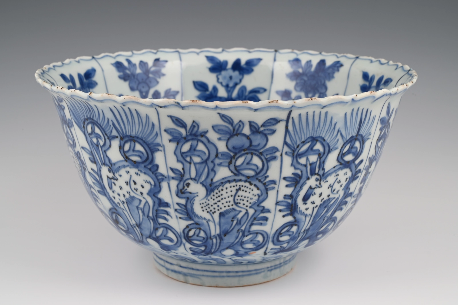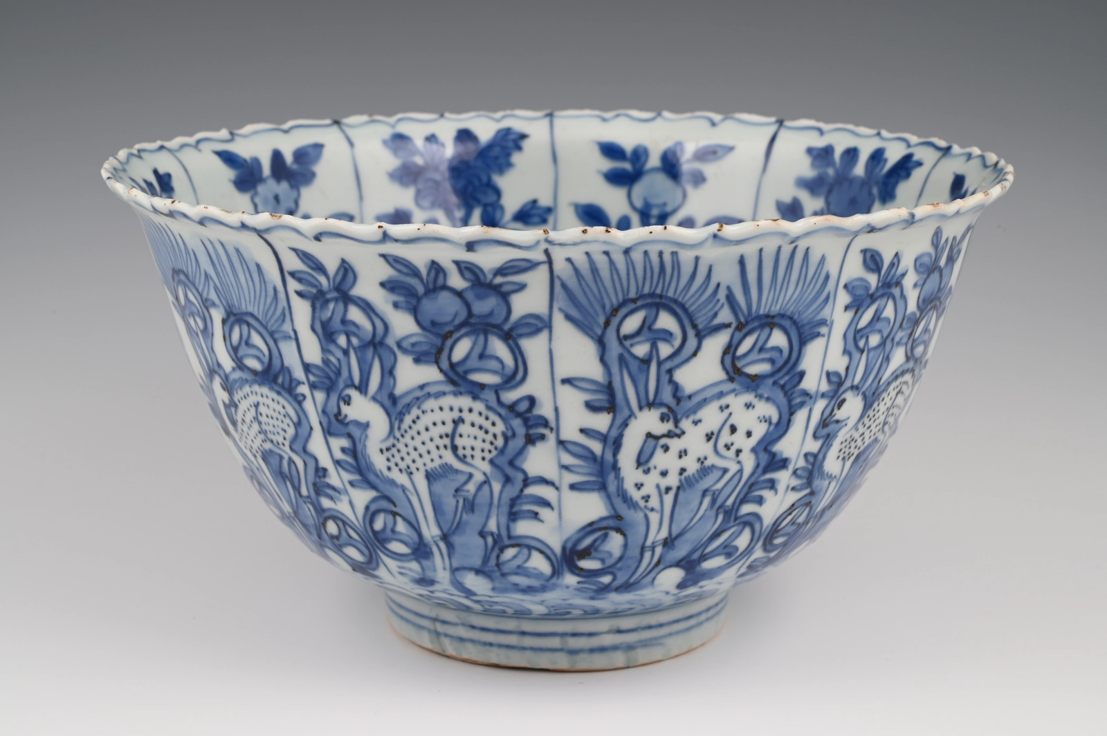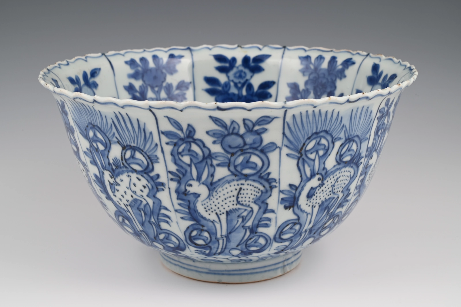 This "Kraak" bowl is decorated with eight fields depicting a deer surrounded by bushes.