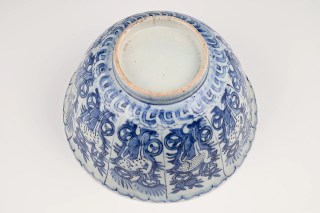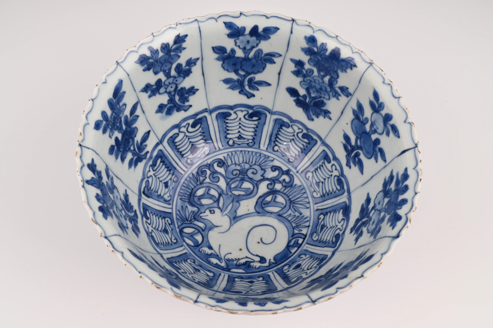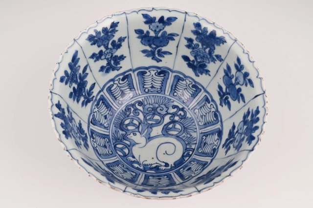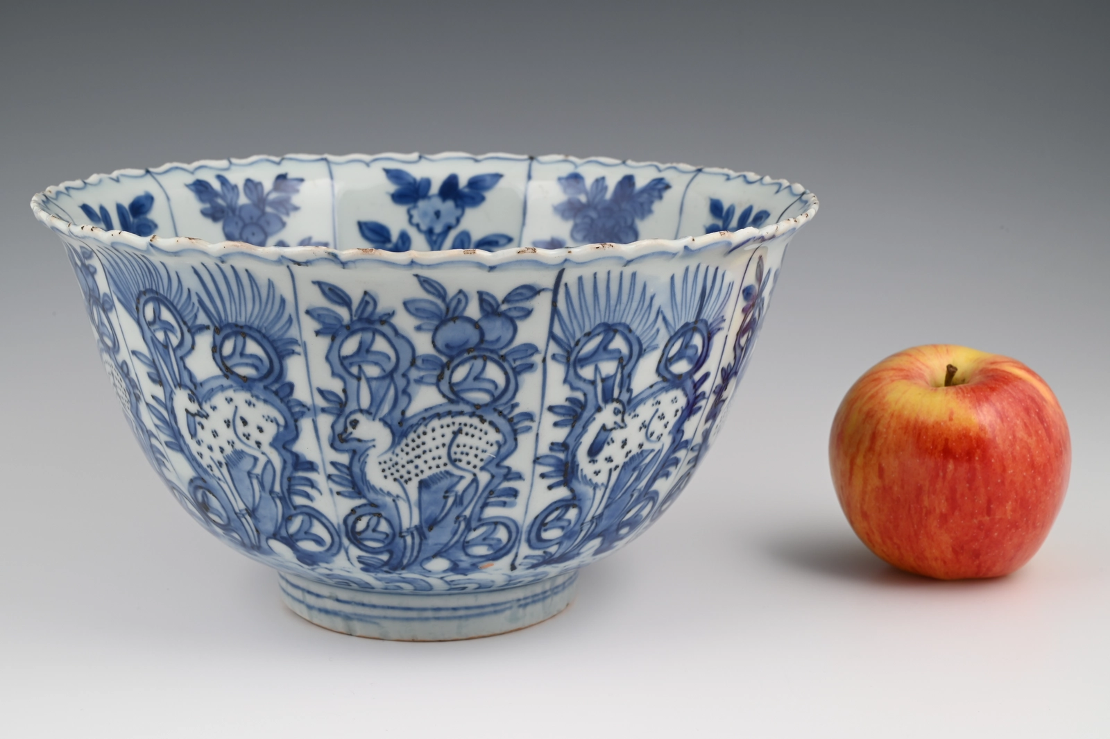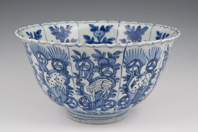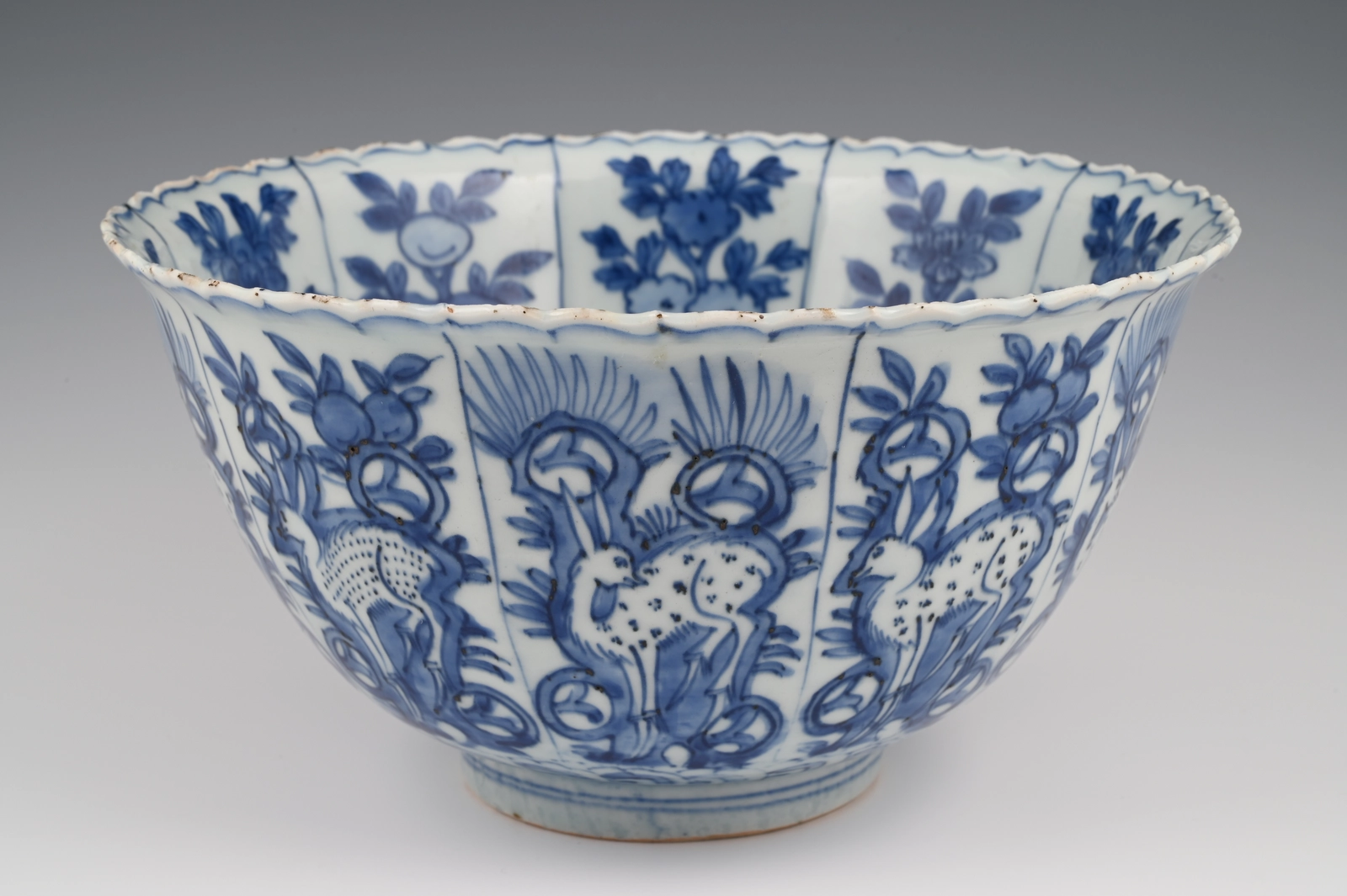 This "Kraak" bowl is decorated with eight fields depicting a deer surrounded by bushes.