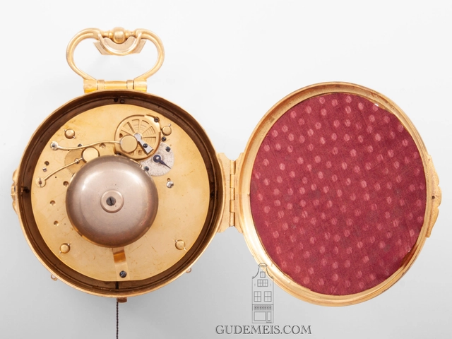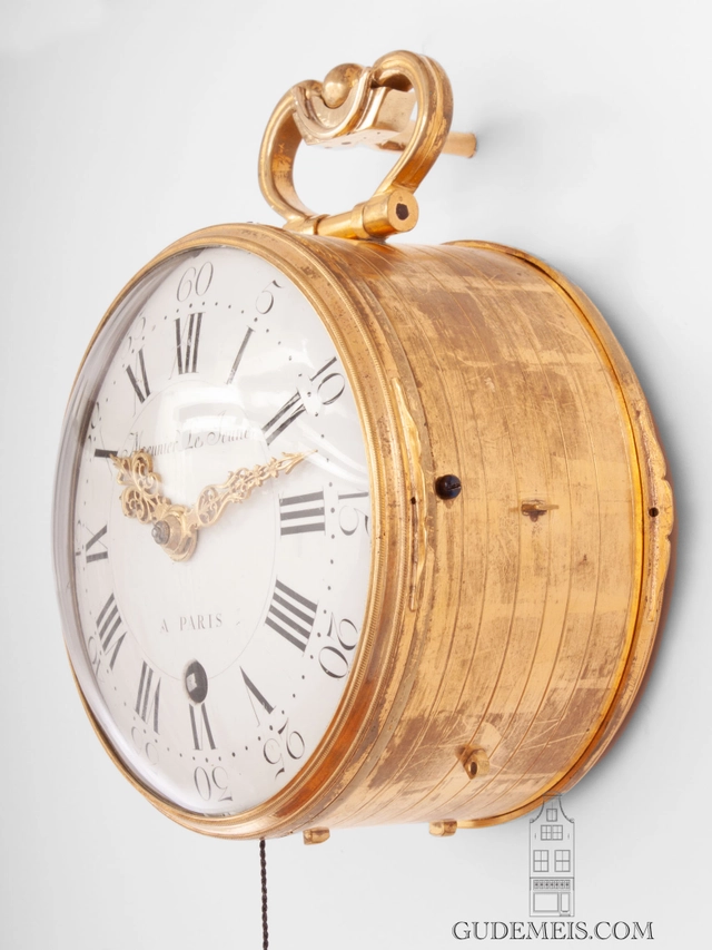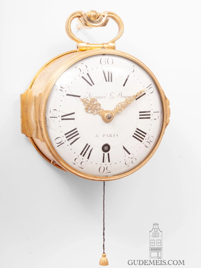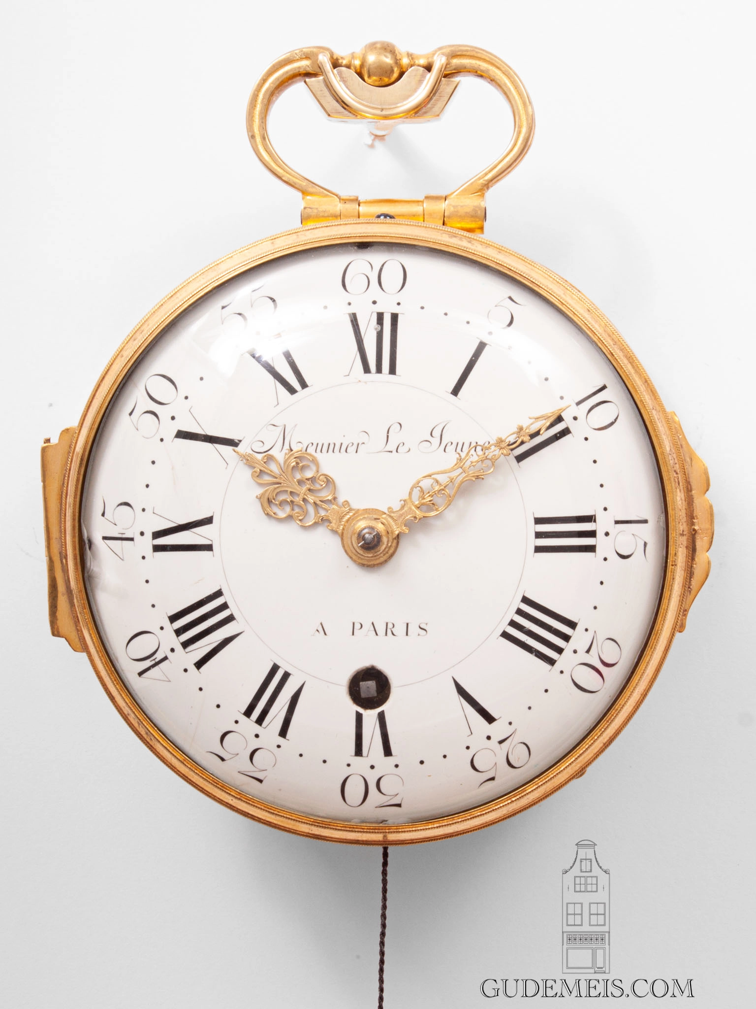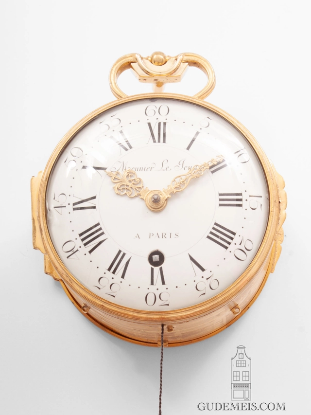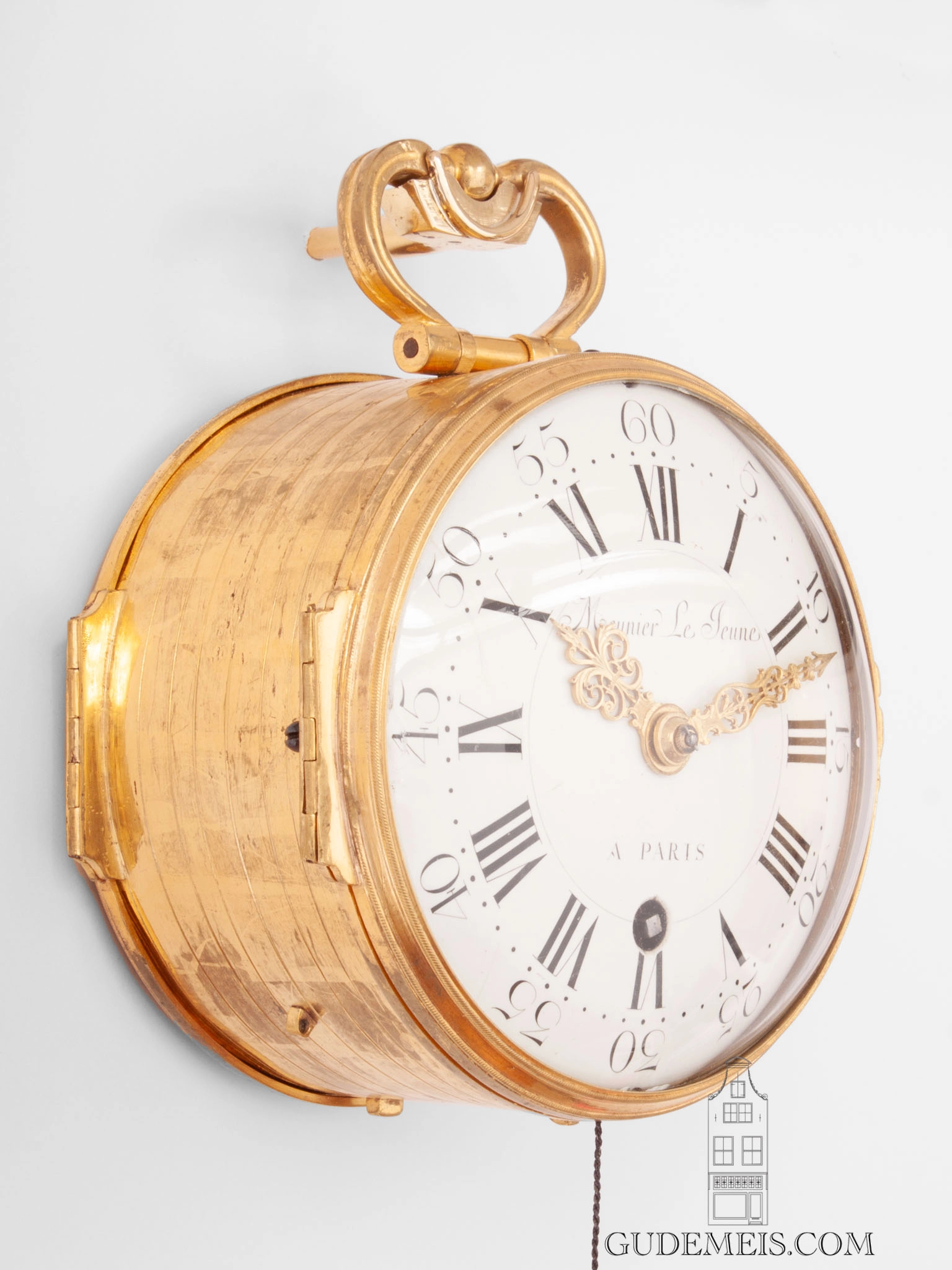 The movement is fitted in an annular functional ormolu case. It is adorned by engraved lines and surmounted by a cast handle. The back door is pierced to let the sound of the quarter repeating through. The whole is hung on a hook on the wall.