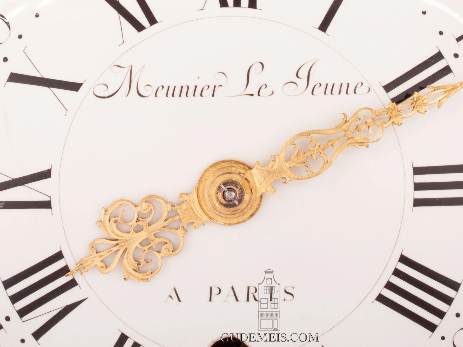 The enamel dial has Roman numerals for the hours and Arabic numerals for the five minute indication. The centre is signed Meunier Le Jeune A Paris. The beautiful foilate and engraved pierced hands are made of gilt brass. Both the style of the numerals and hands are typical for the Louis XVI period.