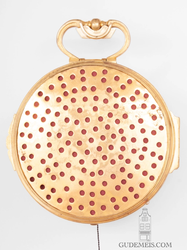 In the third quarter of the 18th Century there must have been a growing need for travel clocks. I can state this because both the ‘Pendules d’officier’ and ‘Capucines’ find their origin around this time. In this early period the production was still fairly small which causes them to be very individual, differing per maker. Besides these ‘Pendules d ófficier’ and ‘Capucines’ which have to be placed on a surface, there were clocks that could be hung. Often these clocks are called ‘coach clocks’ or ‘coach watches’ suggesting that these were hung in a carriage. This might very well be possible but it is also very likely that these clocks were hung on a nail or hook in the room one was staying. This clock has no striking work but is able to repeat the hours and quarters on demand. In this way, one could know what time it was in the dark which was very handy in a time when making light involved making fire. The functional exterior was practical during travel in earlier days, but makes it easy to place it in any interior nowadays. Very practical and fairly rare for this type of clocks is that the clock has a movement of eight day duration.