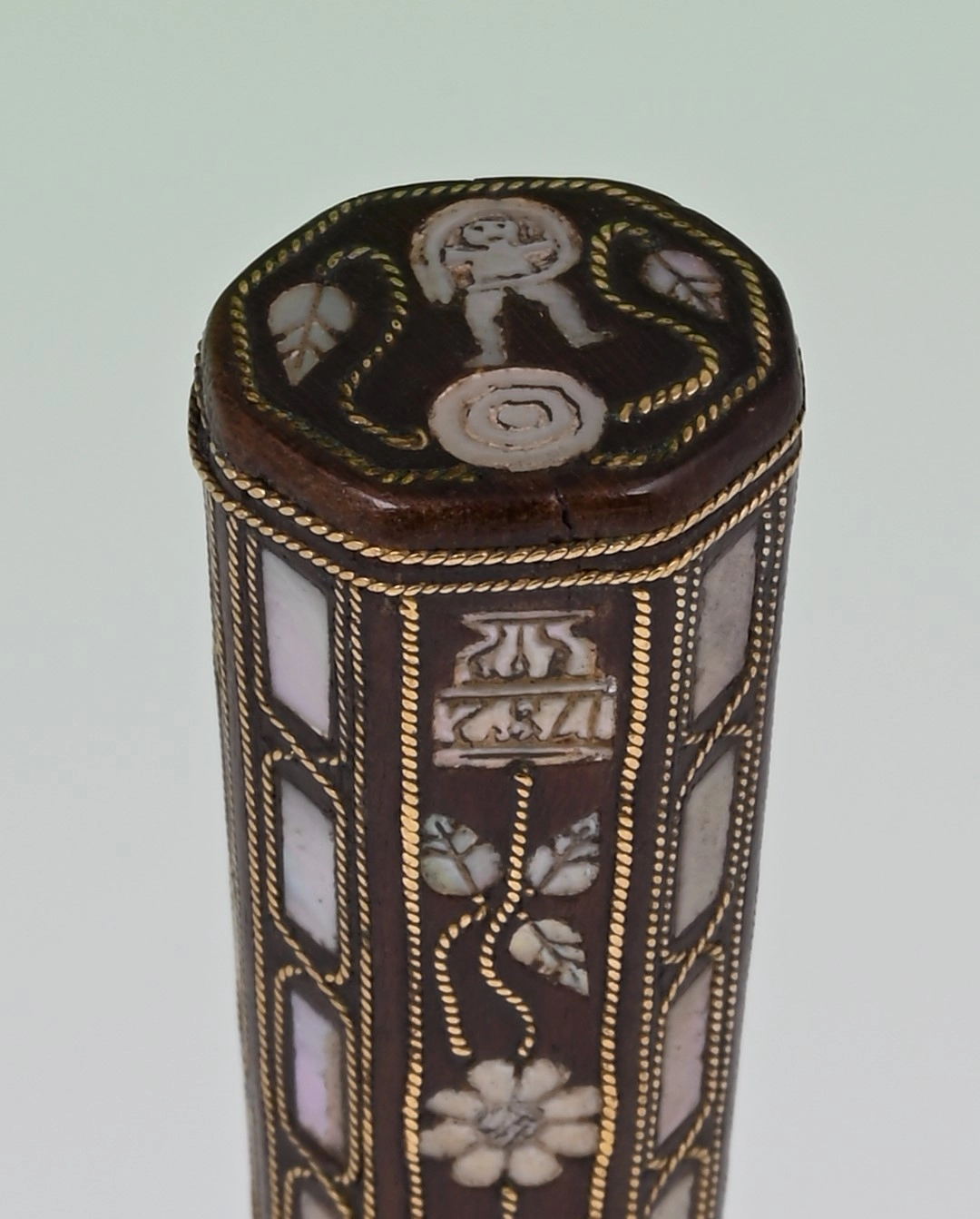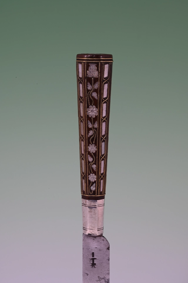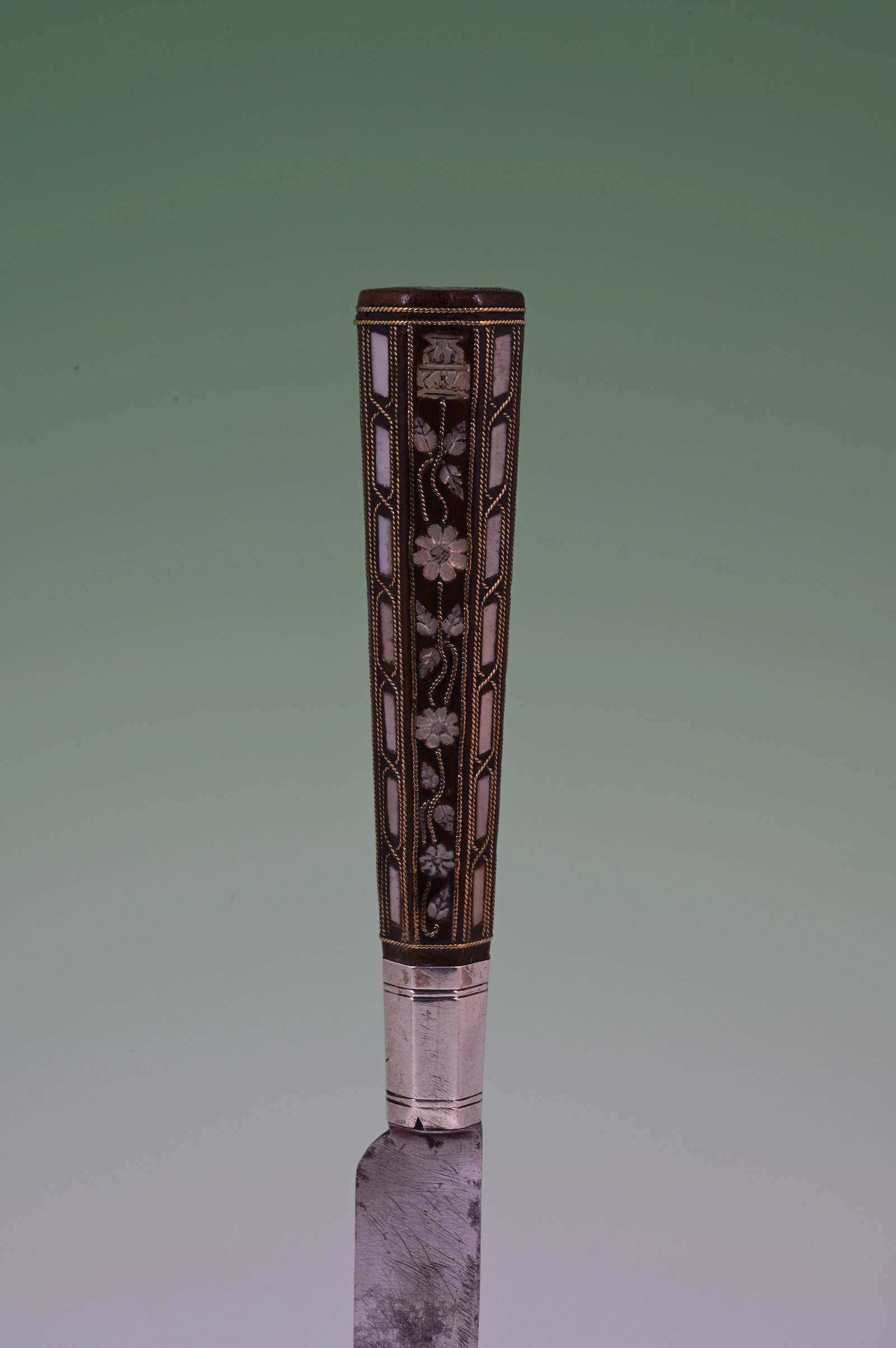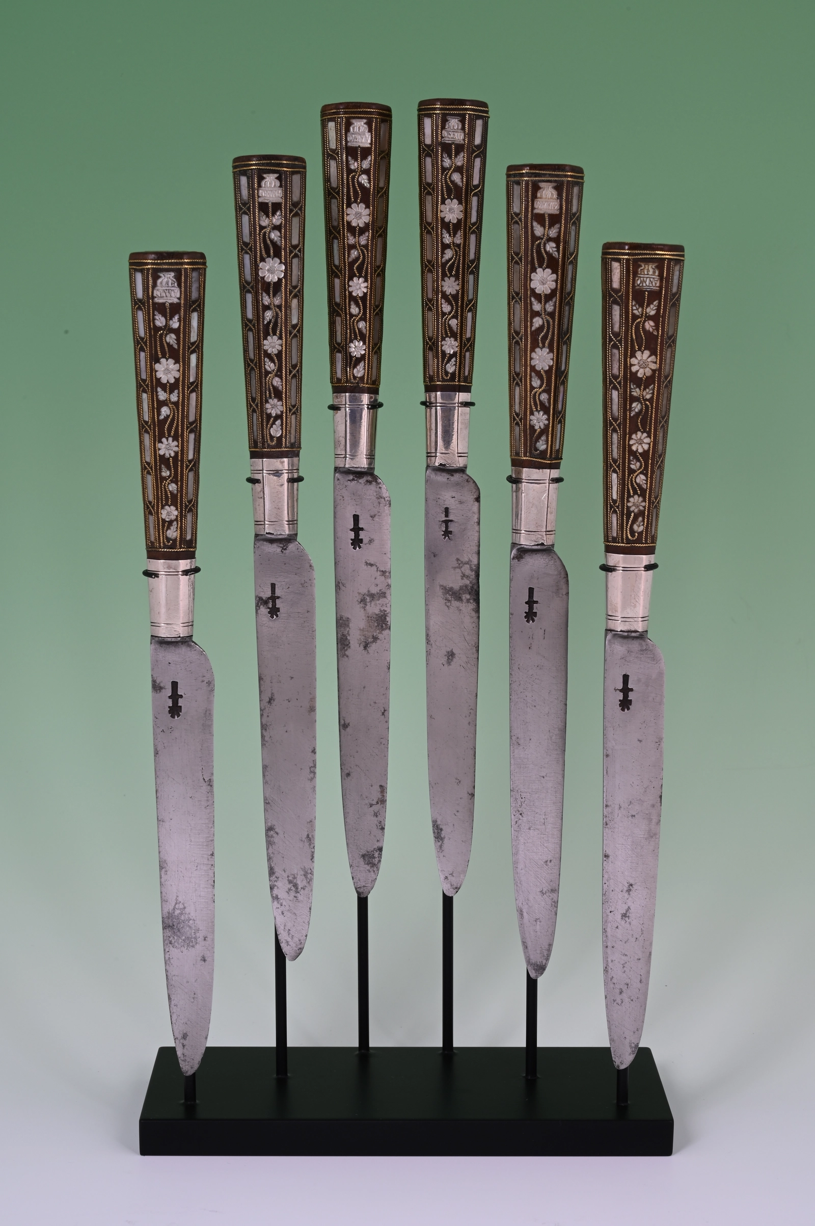 These knife handles are inlaid with engraved mother-of-pearl and twined brass wire