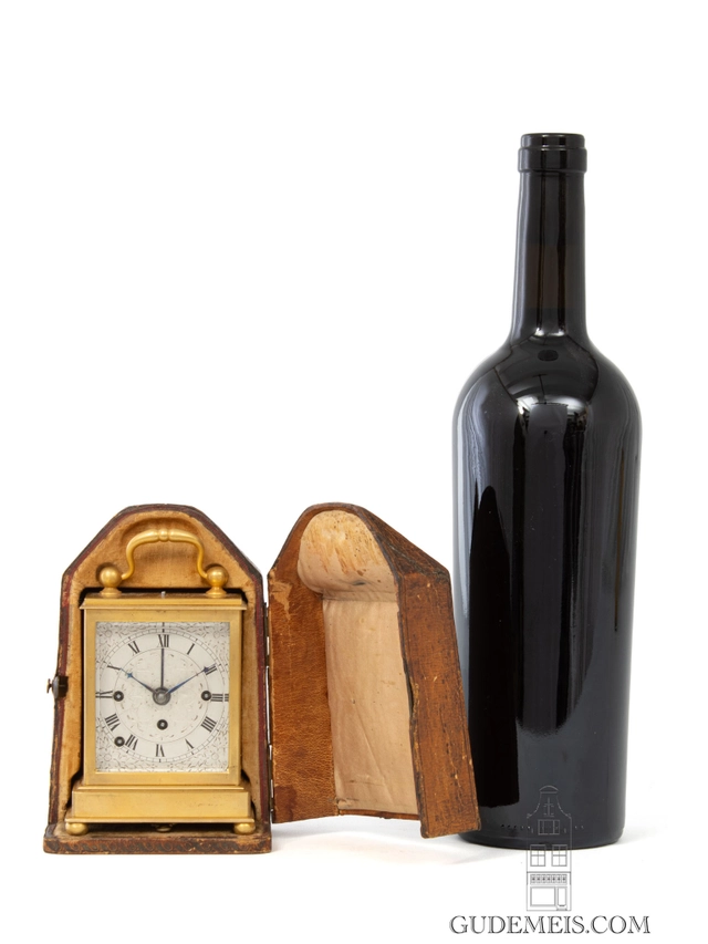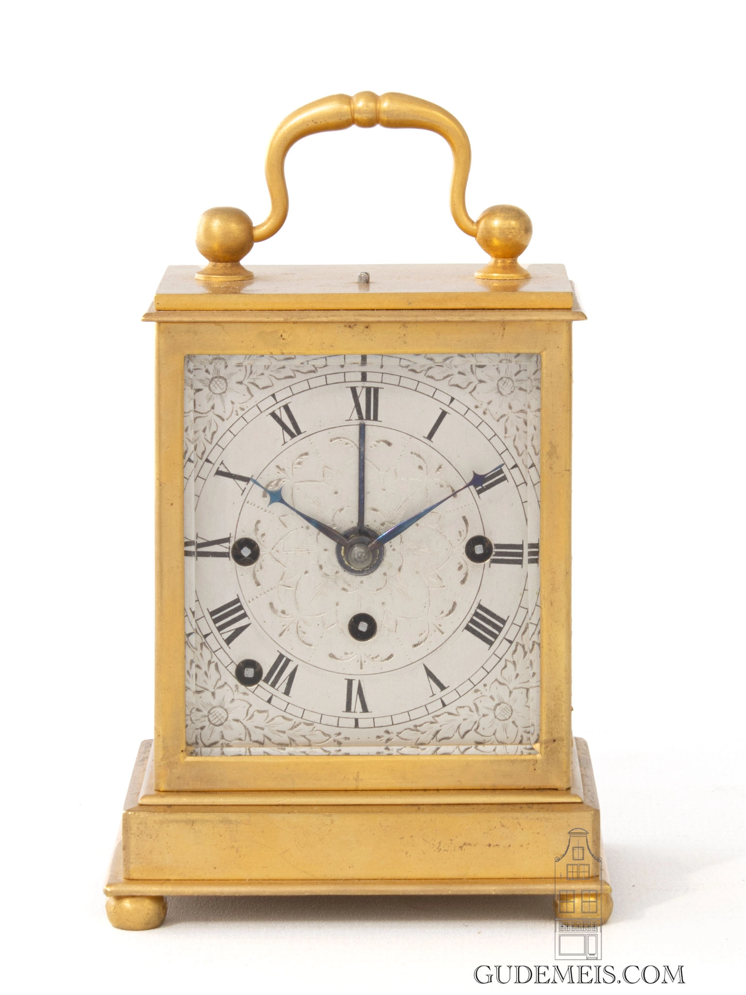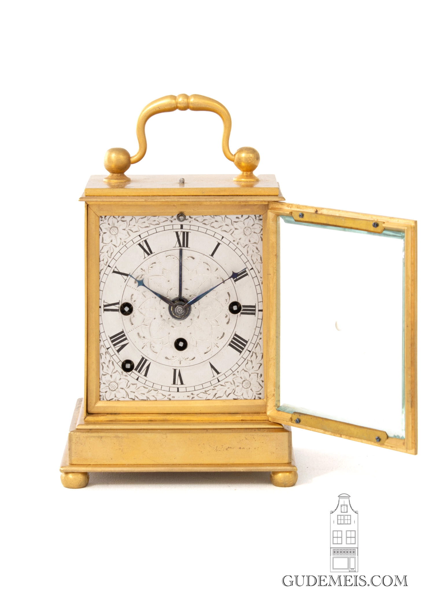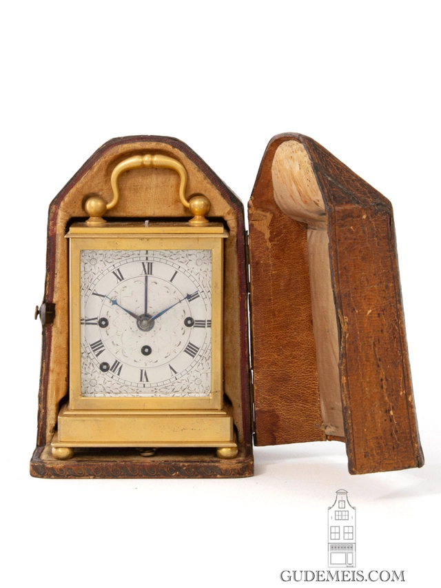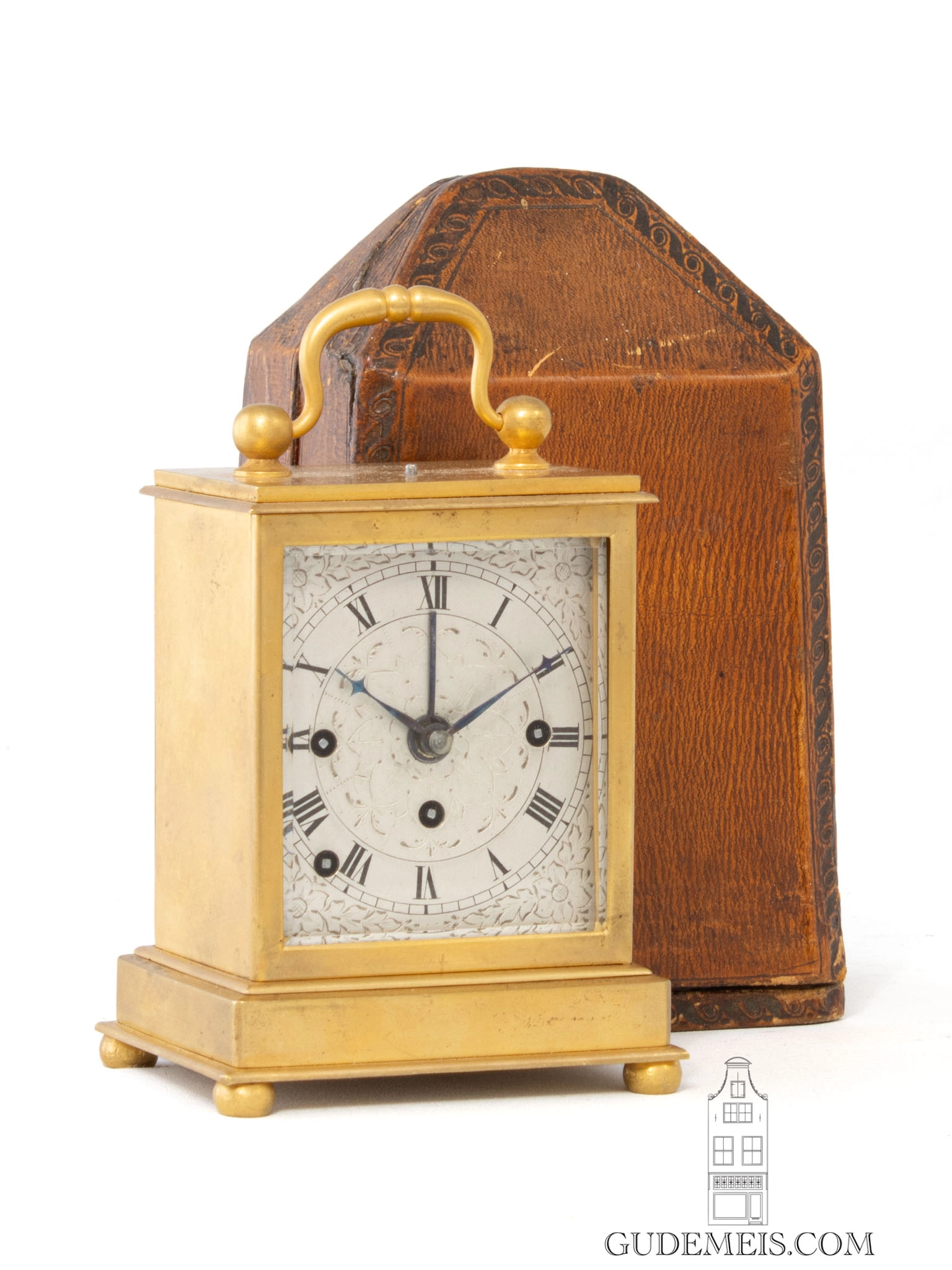 In the Habsburg Empire, Austria-Hungary, a clockmaking tradition developed which started to be more substantial from the third quarter of the 18th Century on. The makers of these clocks mostly made lightly built movements of which the functioning relied on high quality finishing. Many of these clocks have grande sonnerie quarter striking. Just like in Franse, the Vienna clockmakers started to produce travel clocks in the third quarter of the 18th Century. But where the French production started to grow significantly in the second quarter of the 19th Cnetury, the Austrian production remained relatively small aiming at the high end of the market. This lovely clock is exceptional for its small dimensions as well as the omittance of ornament. Although it is a small clock, it still has quarter striking, repetiton and alarm. It also still has it’s original travel case which is rare and attractive.