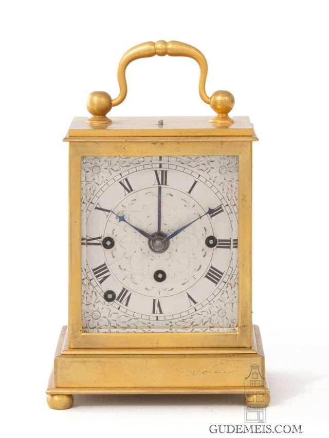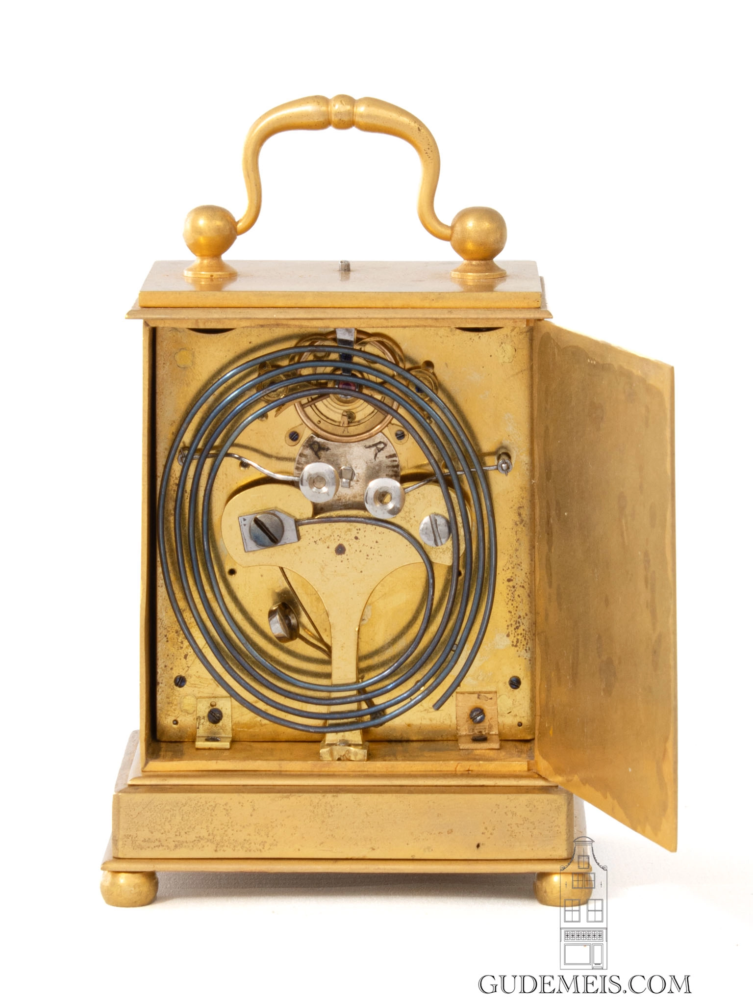 The rectangular gilt brass case is surmounted by a cast arched handle. The front and back of the case have doors. The moulded plinth is raised on bun feet. Together with this clock is the original travel case.