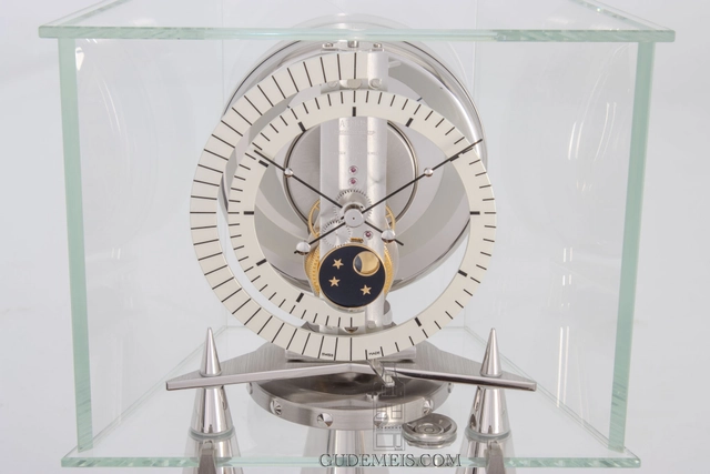 The atmos III type movement is powered by a spring barrel. The large drum at the back of the clock contracts and expands because of changes in temperature and barometric pressure. This movement is transferred by a small chain and used to wind the spring barrel. The movement is regulated by a large balance with an oscillation time of thirty seconds. The rhodium front plate is engraved ATMOS Jaeger LeCoultre SWISS THIRTEEN (13) JEWELS 548.