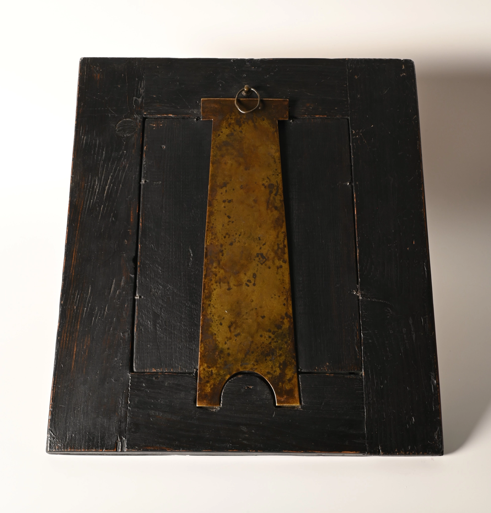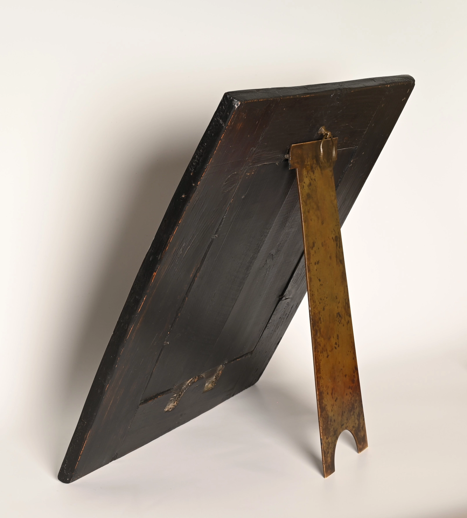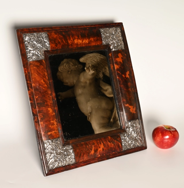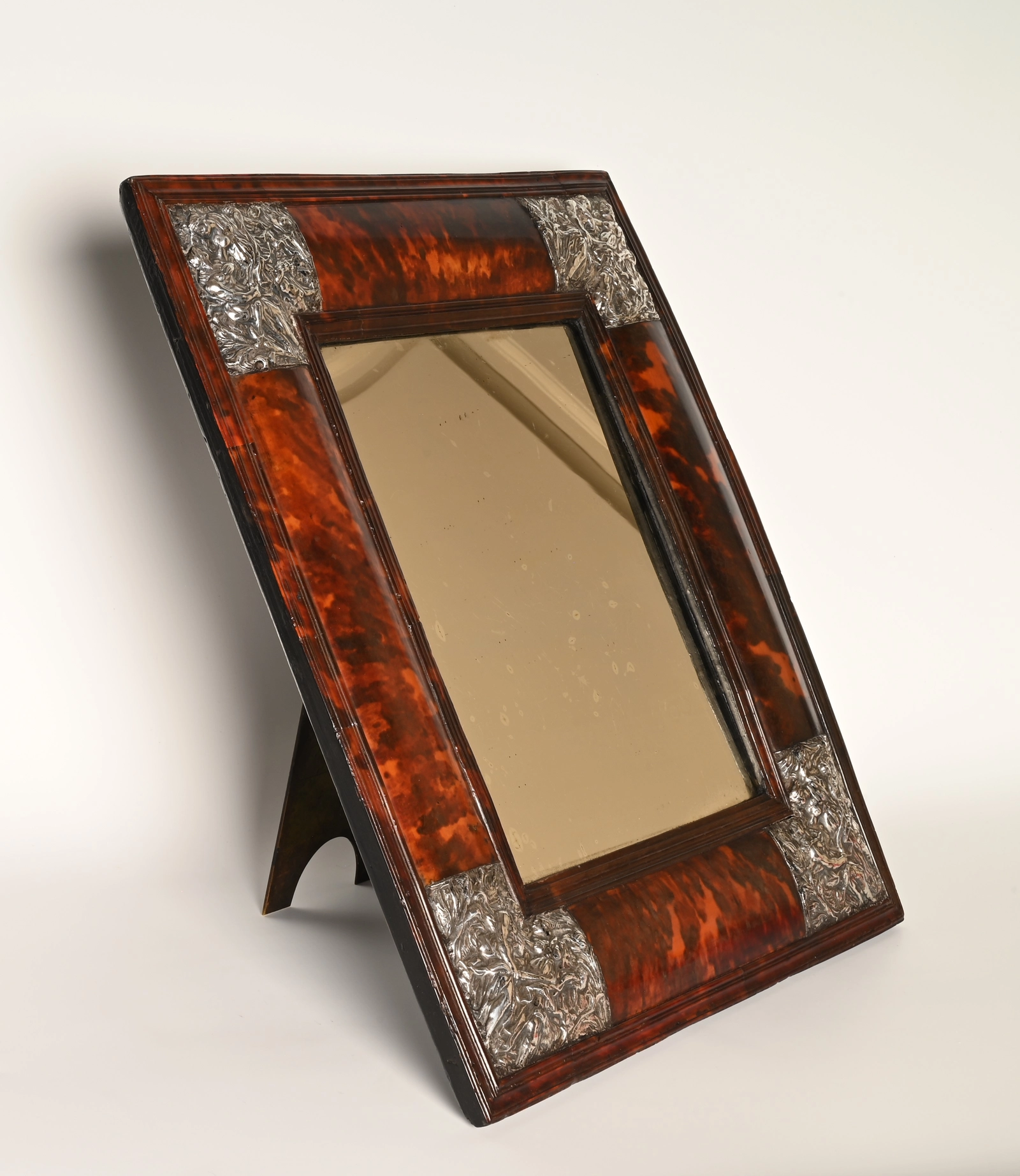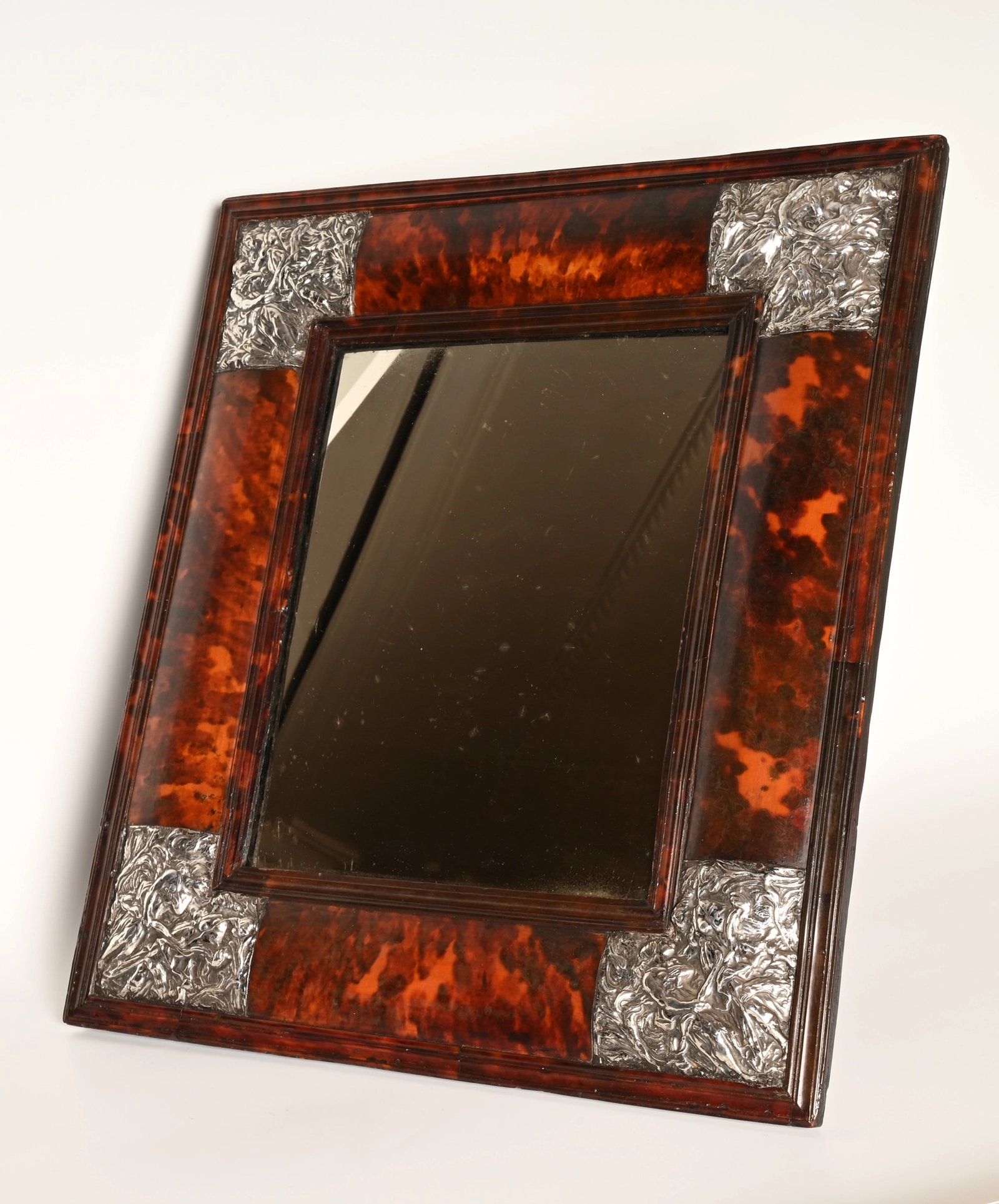A walnut mirror frame plated with tortoiseshell and mounted with silver corner ornaments.