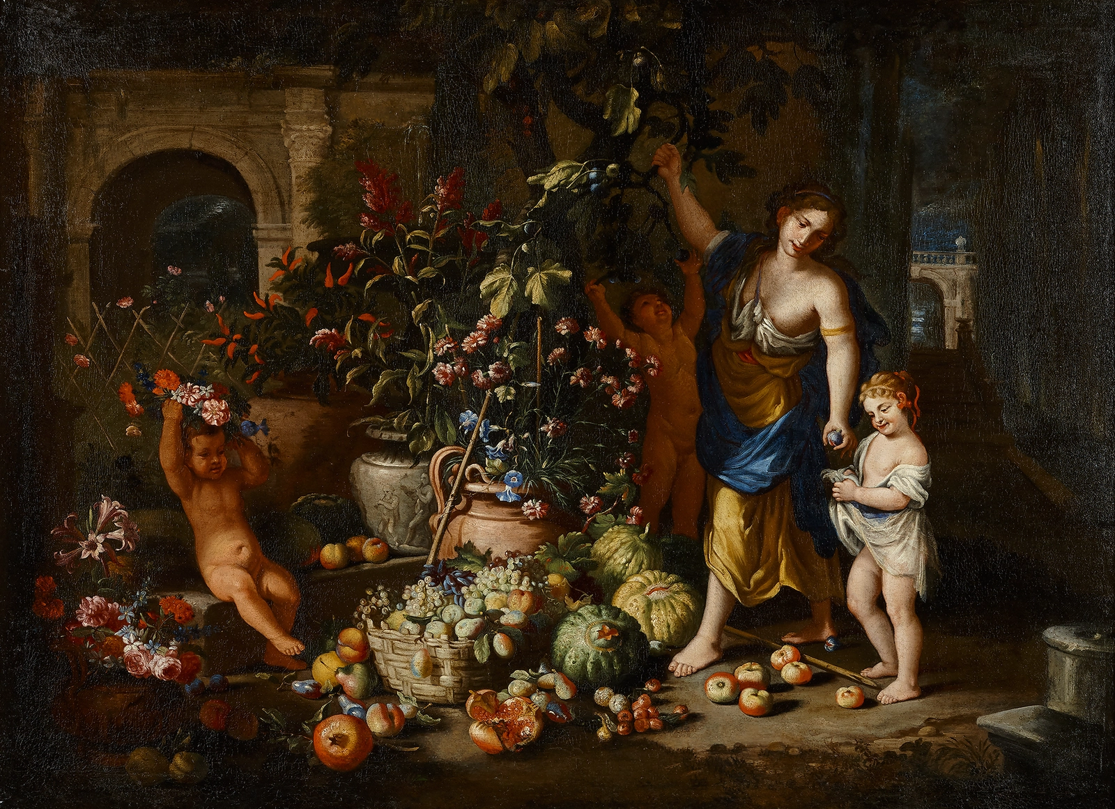 This Italian painting was created in collaboration between the two painters Abraham Brueghel and Nicola Vaccaro. This working method was not unusual in the 17th century. Antwerp-born Abraham Brueghel, a descendant of the famous Brueghels, collaborated very often with other artists, as did his ancestor Jan Brueghel.