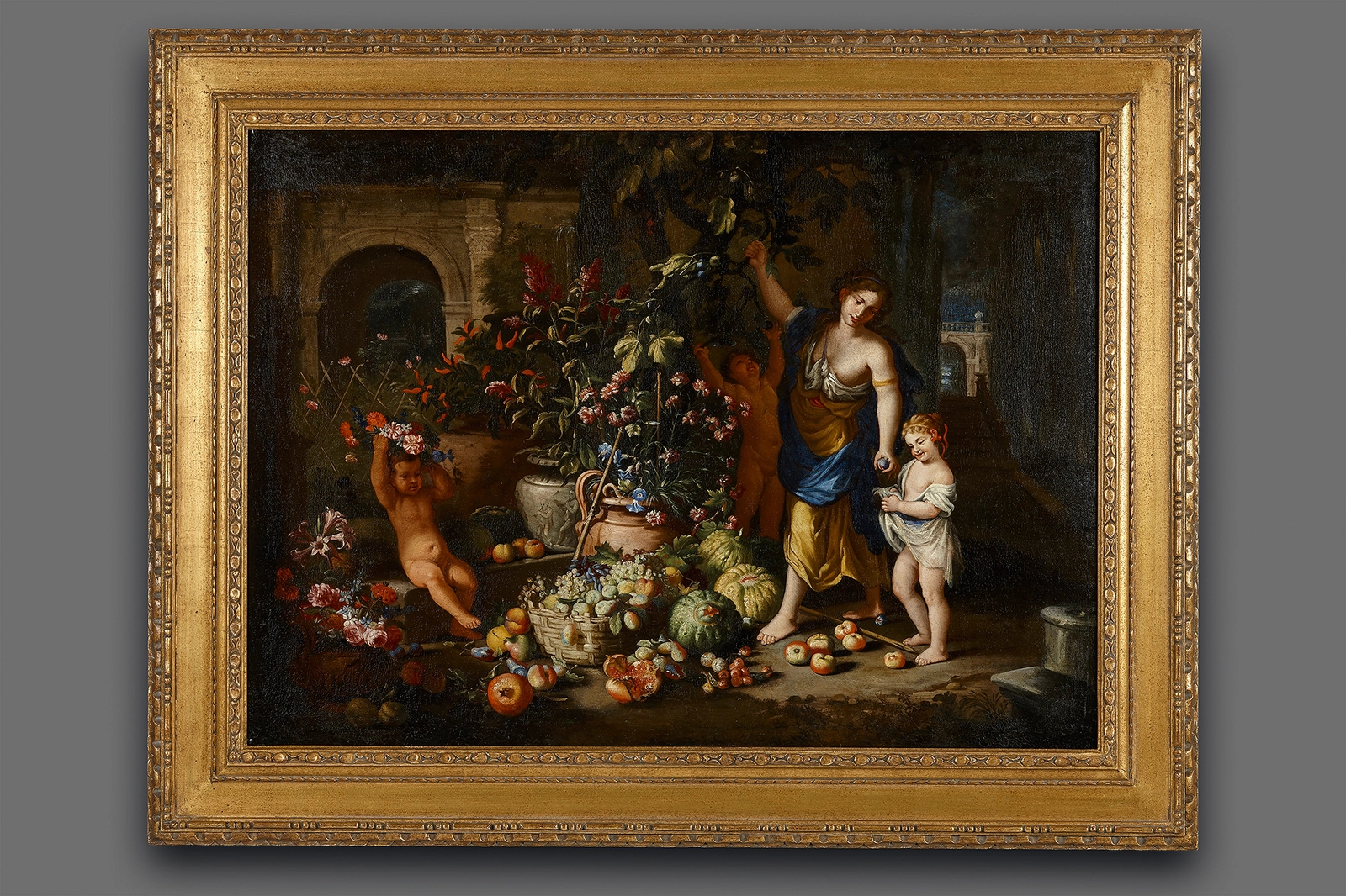 The Neapolitan Nicola Vaccaro was an artist and theatre director who, as a painter, depicted various subjects on canvas. He worked together with numerous painters, such as Aniello Ascione and Andrea Belvedere, for whom he integrated staffage into still lifes and landscapes. This particular work is an excellent example of the collaboration of Vaccaro and Abraham Brueghel and their skills. It was painted sometime between 1680 and 1690.