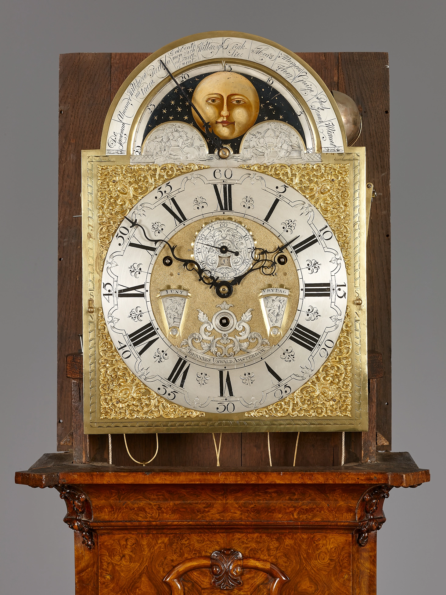 The dial with gilt centre and silvered engraved ring displays the hours in Roman numerals and the minutes in Arabic numerals. The numeral ring is flanked at the corners by gilt bronze openwork spandrels. Below the numeral XII is a seconds dial incorporating a date display. Above the numeral VI is an elegant, silver-plated emblem bearing the signature Johannes Uswald Amsterdam. To the left of this emblem is the month indicator, to its right the date indicator.
