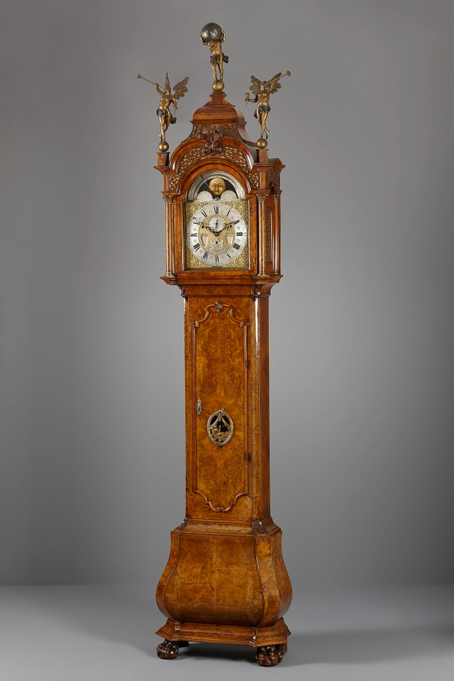 The case is entirely executed in burr walnut veneer. The bombé base stands on claw feet and features chamfered corners that extend all the way up to the hood, as well as fine carvings at the top and bottom. The door granting access to the dial is flanked by free-standing pillars, The motif of the arched hood’s front is repeated on both sides of the hood, and the whole is crowned by three giltwood figures of Atlas flanked by two winged trumpeters.