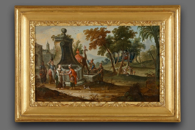The depiction is based on the Old Testament story of Rebekah and Eliezer at the Well (Genesis 24). Abraham sends his servant with ten camels to his native region to find a good wife for his son Isaac. The right bride would offer water not only to the thirsty traveller but to his camels, as well. At a well he meets Rebekah. She offers him drinking water, but also draws water for all his camels. This convinces Eliezer that she is the chosen one to be Isaac’s wife.