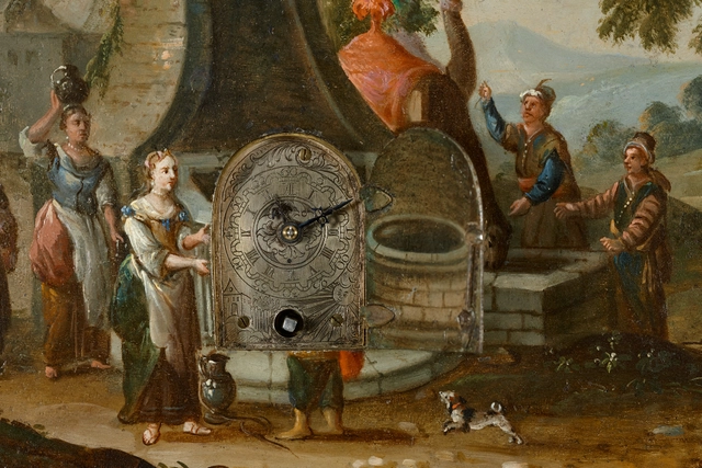 The centre of the painted well features a door that can be opened. Behind this a silver-plated and engraved dial indicates the hours and minutes. The timepiece has a going mechanism with verge escapement. With every tick of the clock, the machine is driven so that one can see the caravan moving forward a step. The running time of the timepiece is about a week.