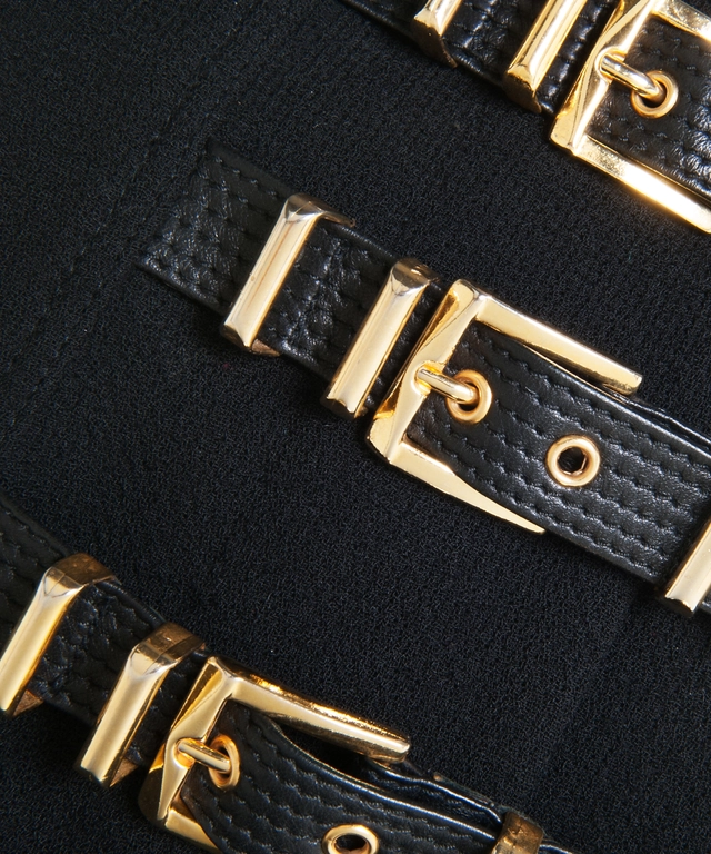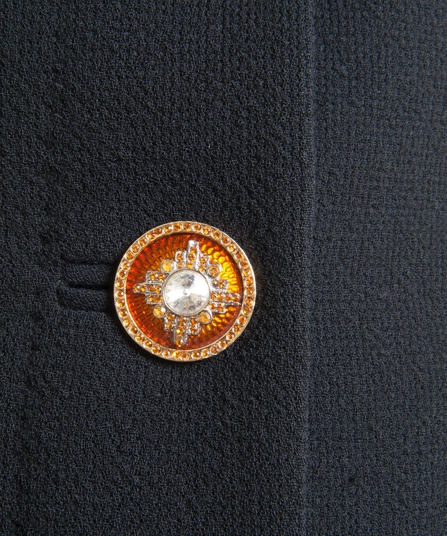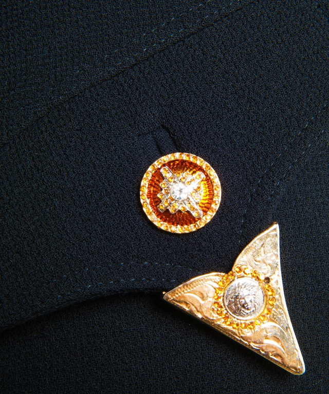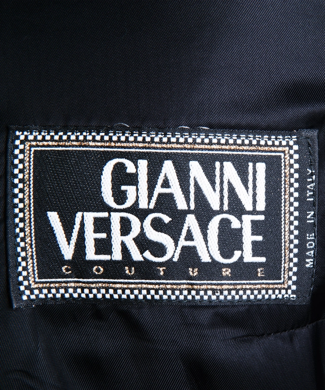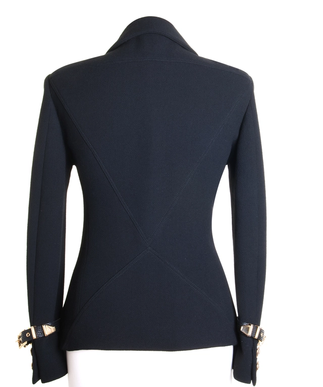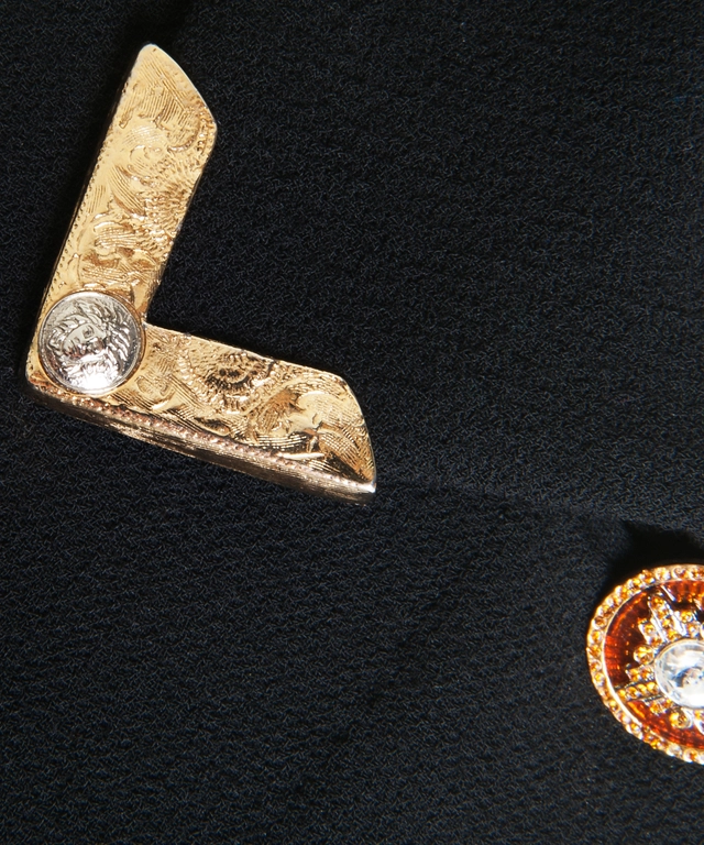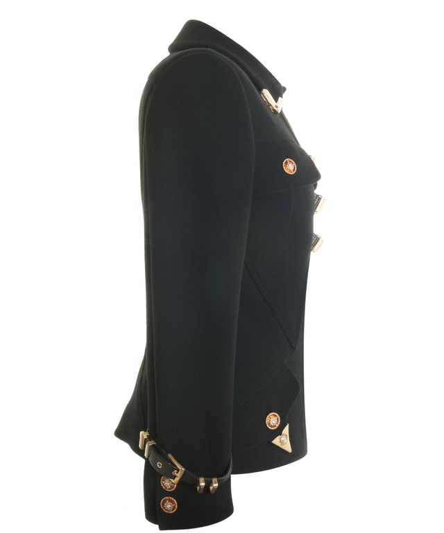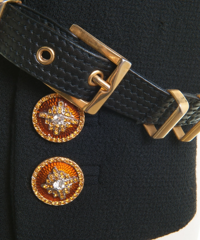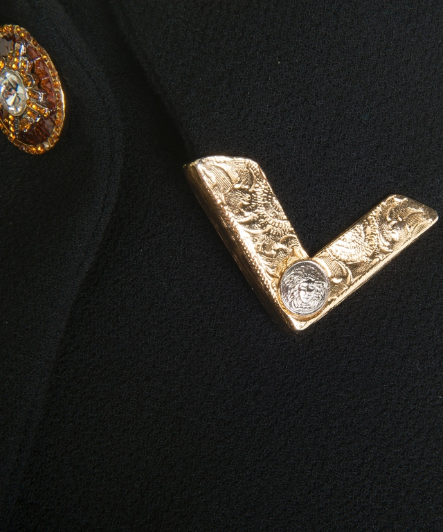 The jacket, presented on the 1992 runway by Helena Christensen, is made of a tangerine virgin wool crêpe featuring a tailored cut with padded shoulders, a clearly defined waist and piped button holes and is most opulently adorned with finely engraved metal fittings with medusa heads, buckled leather straps and a total of ten ornate rhinestone couture buttons. The jacket closes at the front with two couture buttons, four hidden buttons and three buckled leather straps.