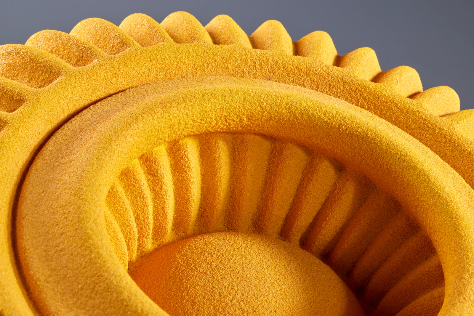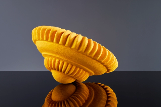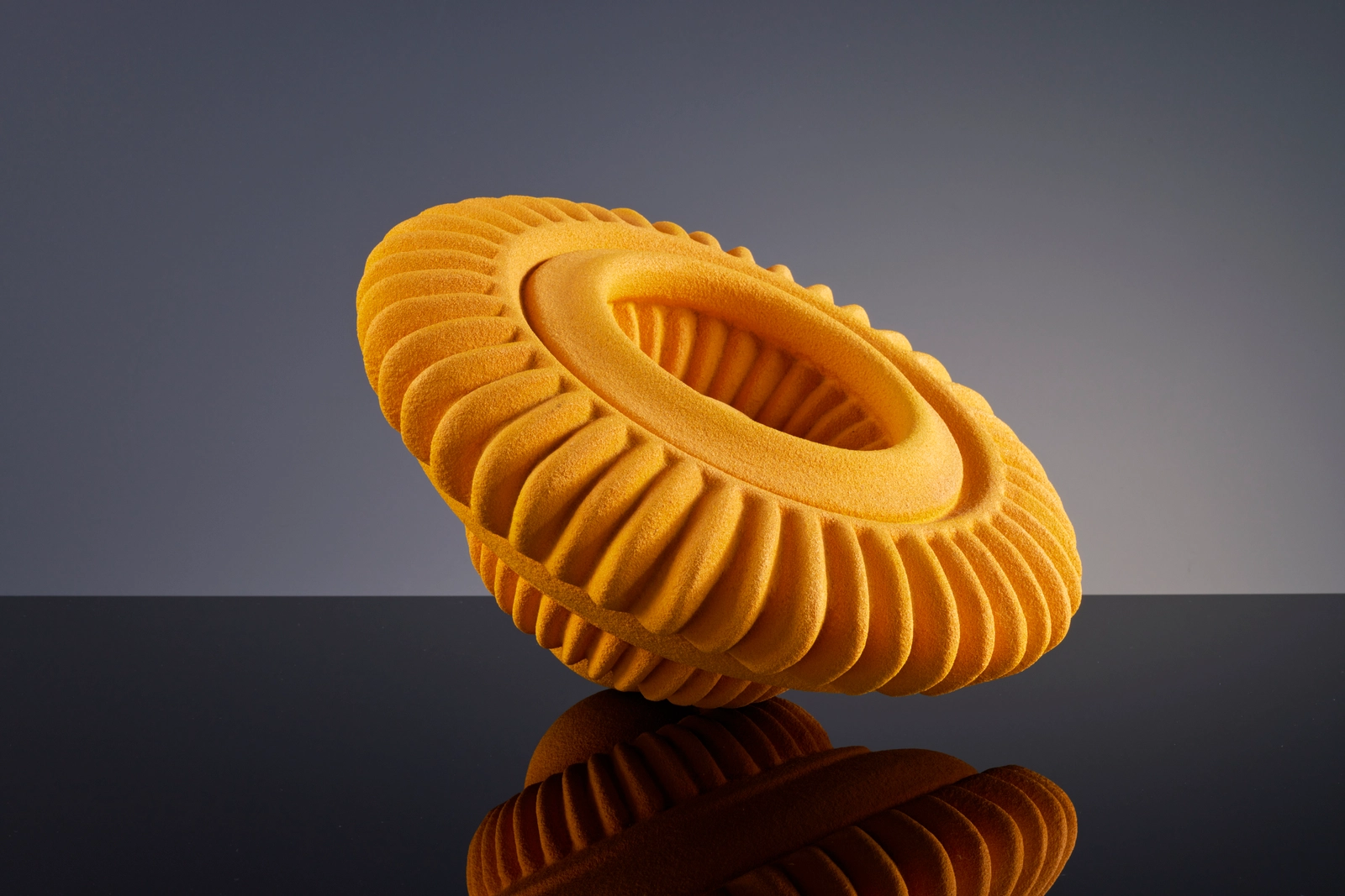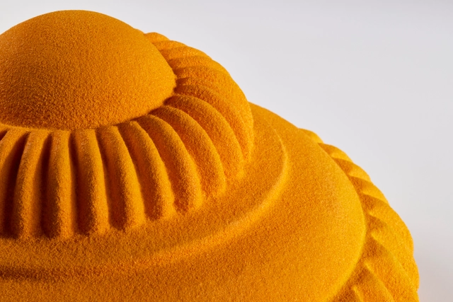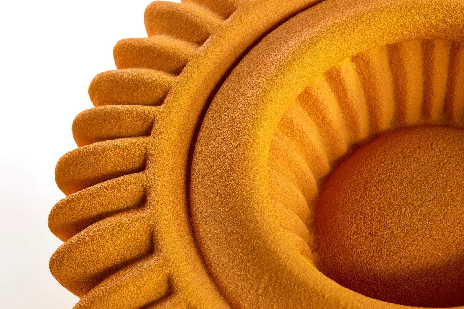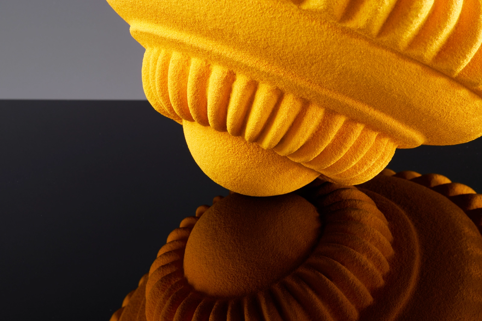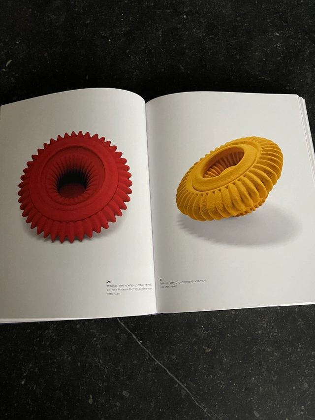 Similar sculpture in red, in the collection of the Boymans Van Beuningen museum, Rotterdam. Stoneware with coating of sand, pigment powder, and lacquer.