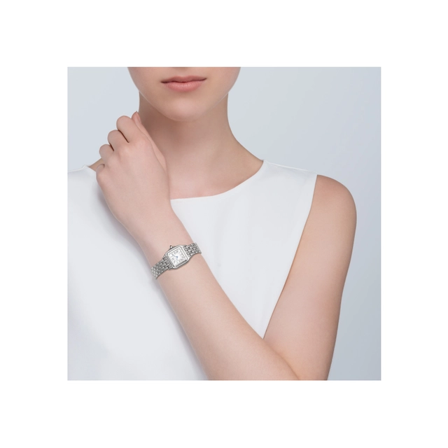 Panthère de Cartier watch, small model, quartz movement. Case in steel, dimensions: 22 mm x 30 mm, thickness: 6 mm, crown set with a synthetic blue spinel, silvered dial, blued-steel sword-shaped hands, steel bracelet. Water-resistant to 3 bar (approx. 30 meters).