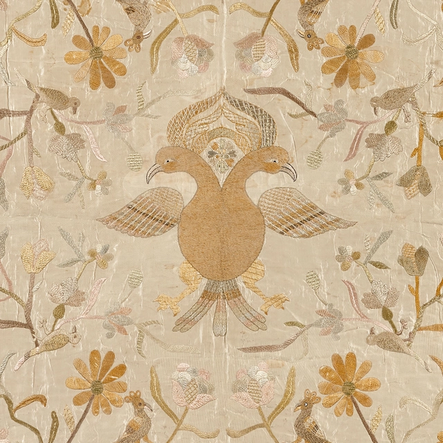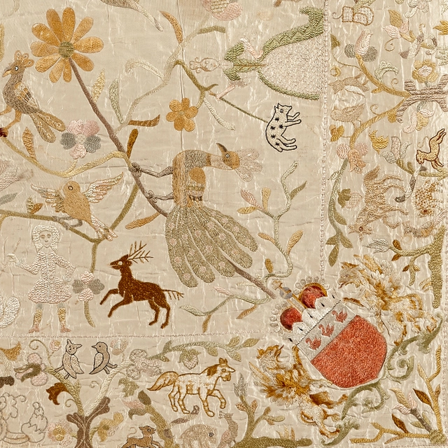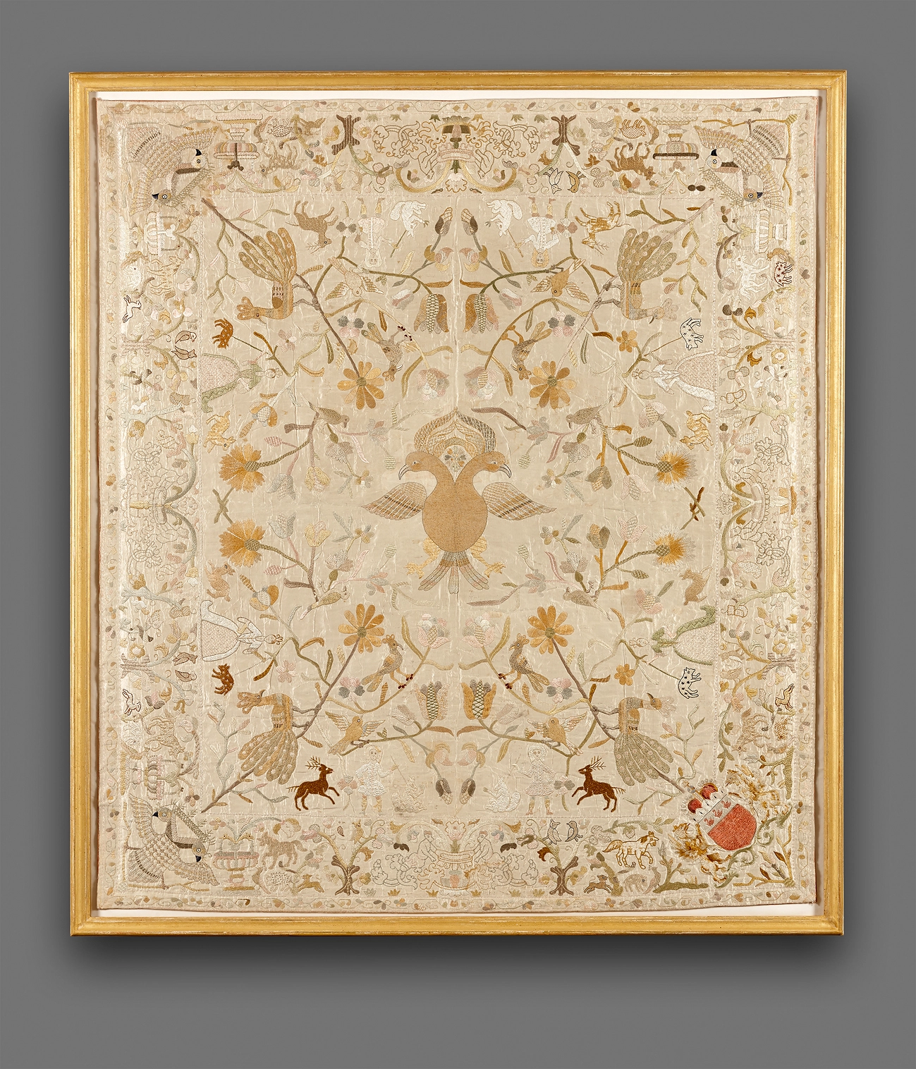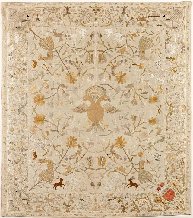 A rectangular silk spread with richly embroidered silk decoration. In the centre of the spread is the double-headed eagle of the Habsburg Empire, surrounded by an elaborate tableau of flowers, wildlife, fowl and noble figures in hunting scenes, divided into four quarters. The whole is framed by a wide edge depicting fountains and a rich assortment of animals and mythical creatures. The double-headed Habsburg eagle is repeated at three of the corners, while the fourth bears the coat of arms of the bedspread’s recipient, the Duke of Ursel.