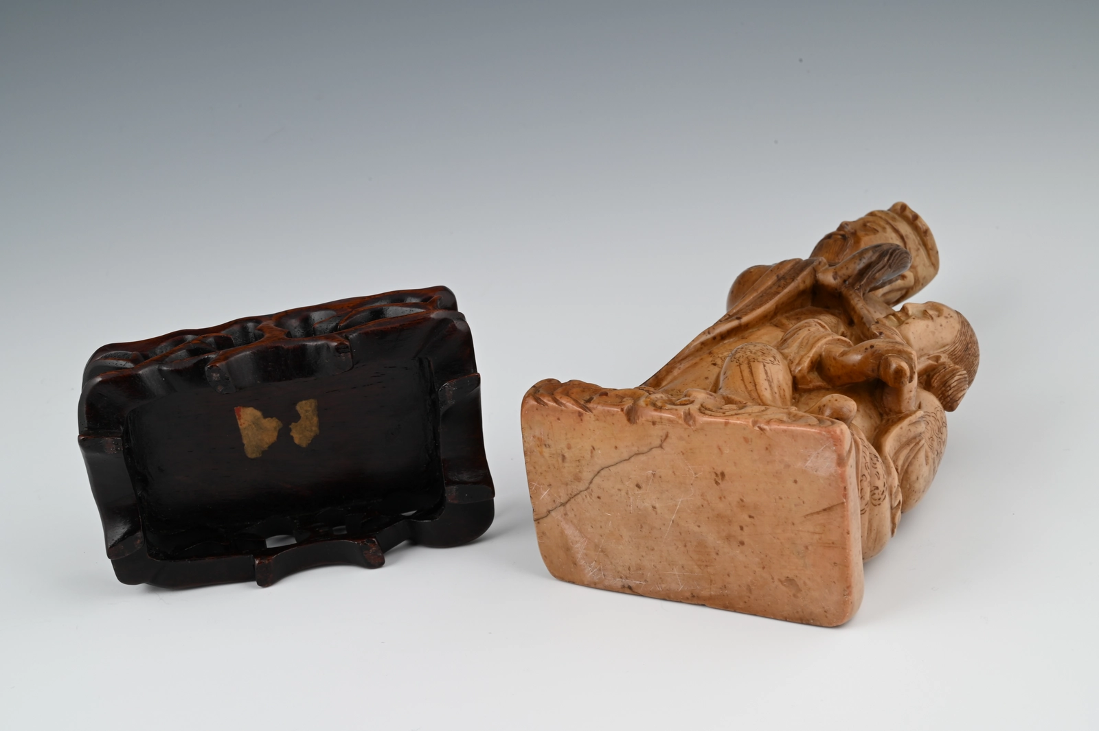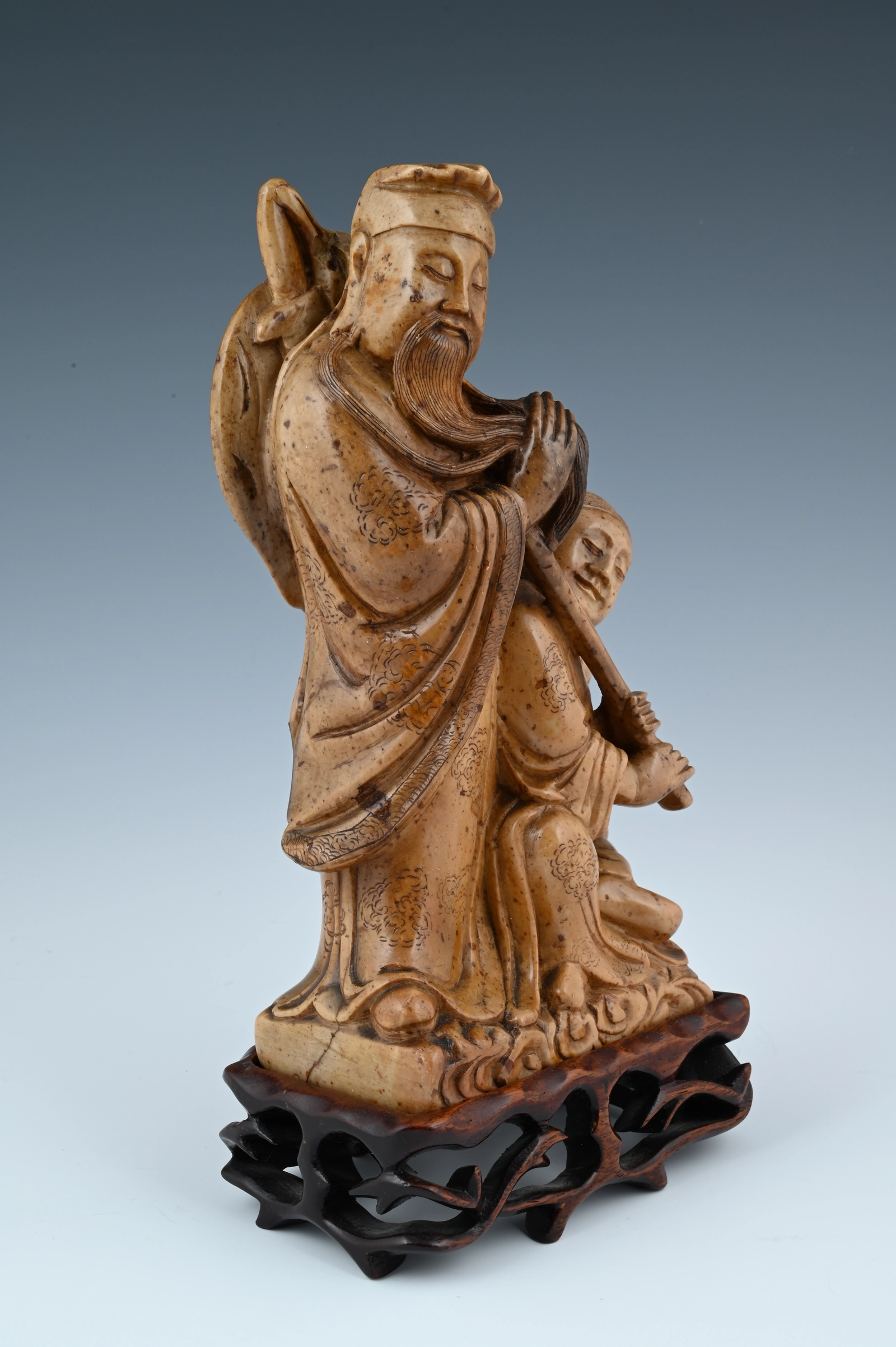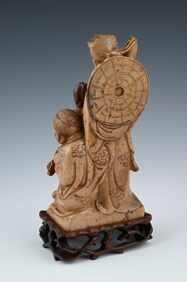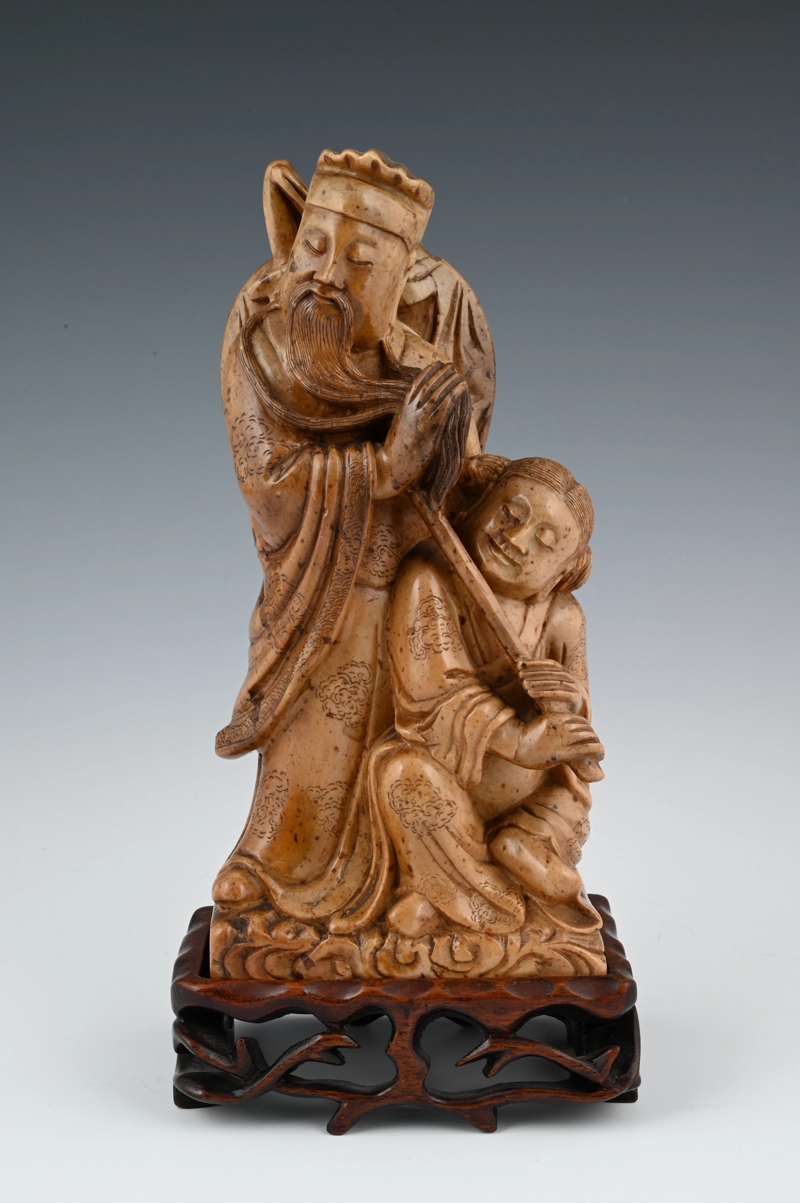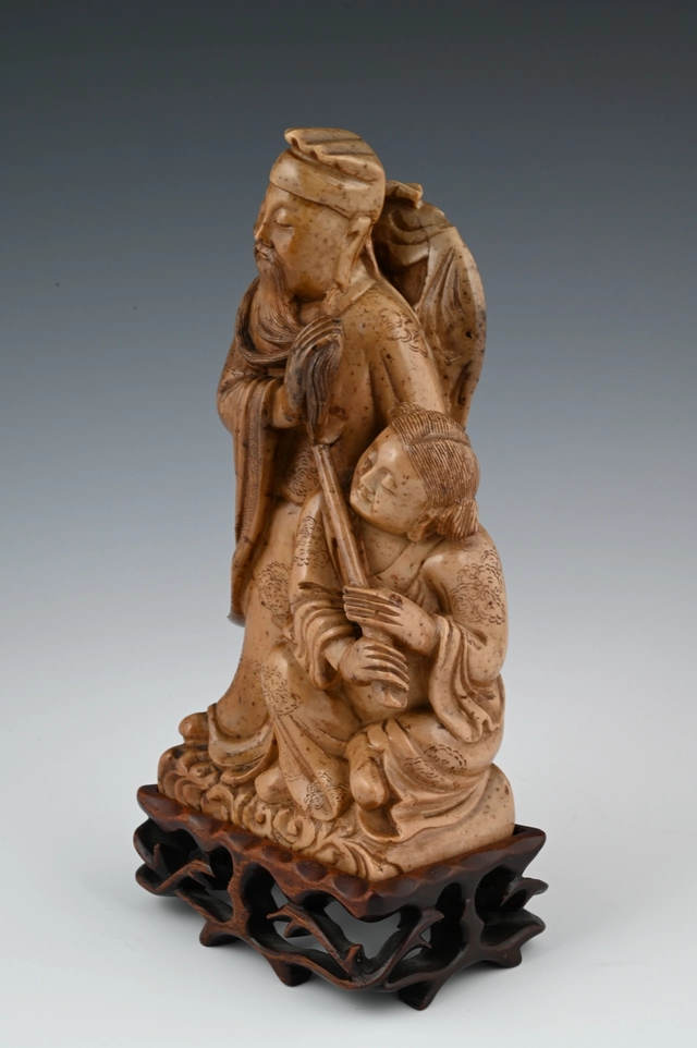 This sculpure is made of soapstone, beautifully engraved, with original matching base.
