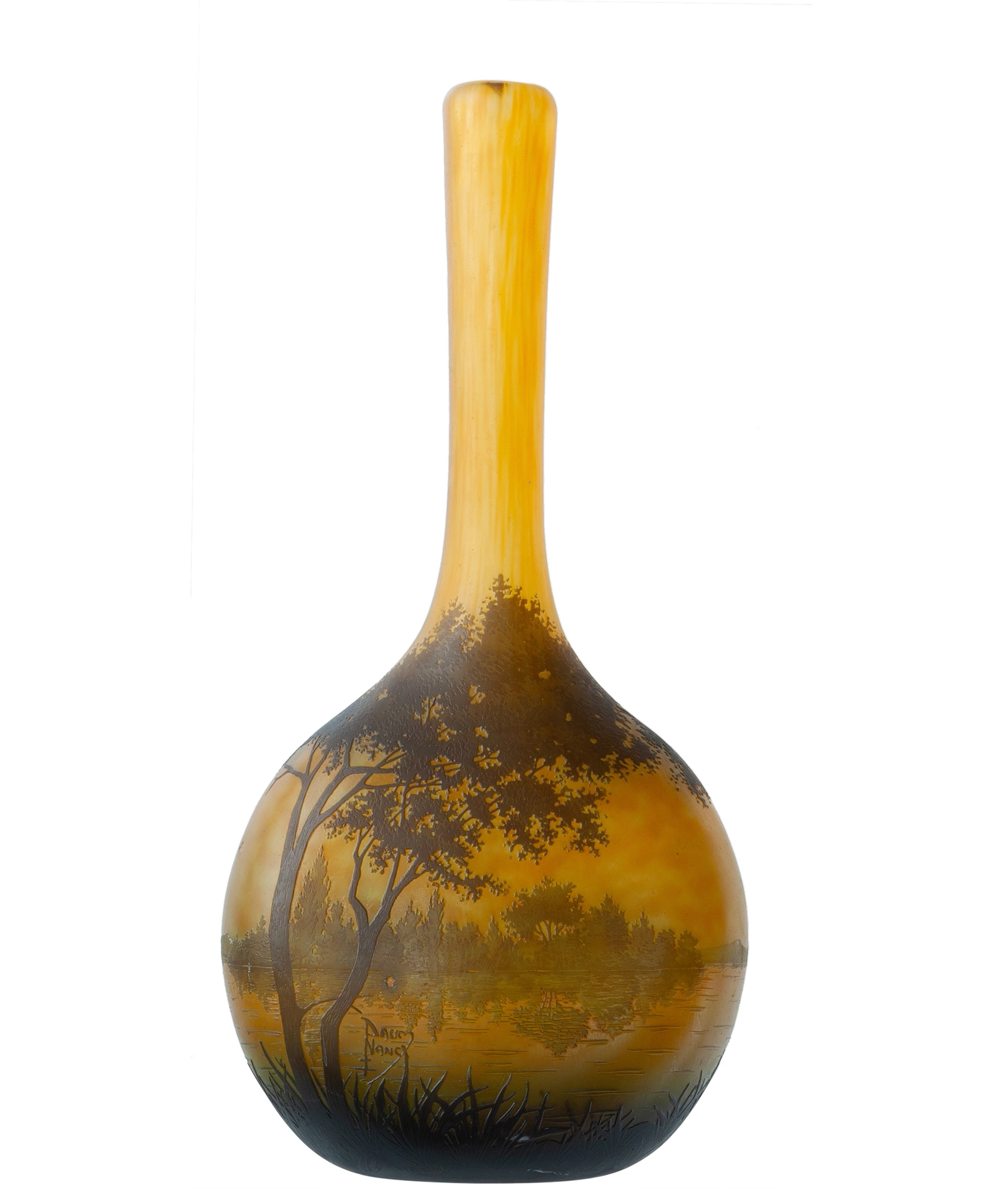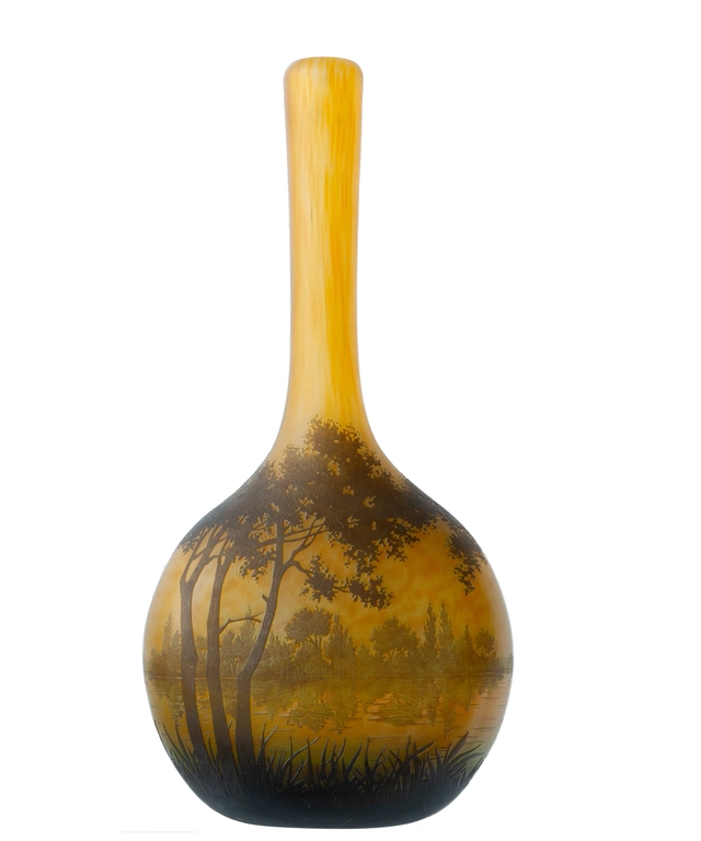 A light brown and yellow-orange multi-layered acid-etched glass vase decorated with a riverbank, trees and vegetation. AÂ Circumferential lake landscape.