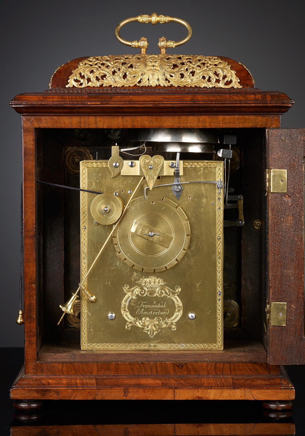 A Dutch table clock with a VII-inch square dial. The silver-plated chapter ring signed ‘Fromanteel, Amsterdam’ on a gilded brass plate with fine matted centre. Above the VI, a calendar aperture; blued steel hands, a silvered alarm disc, the four corners embellished by gold-lacquered, winged cherub spandrels. The movement with a verge escapement and a striking mechanism on a count wheel, mounted on the back plate, striking the whole hours on the large bell and the half hours on the small bell (Dutch Striking). On the right side a pull for winding the spring driven alarm. A richly engraved foliate cartouche with signature "Fromanteel, Amsterdam" on the finely engraved backplate. The striking mechanism on the countwheel is mounted on this backplate.