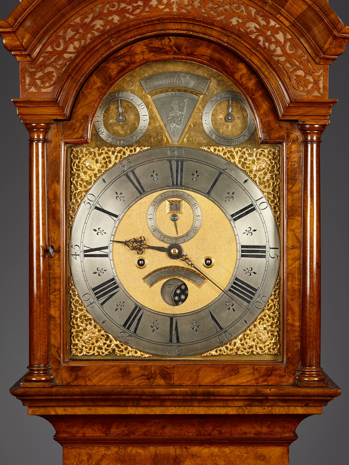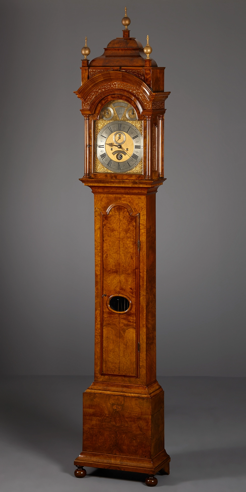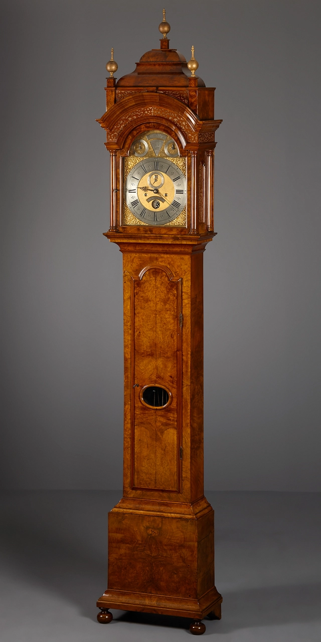 The oak case is veneered overall with burr walnut and stands on four bun feet beneath a moulded plinth carrying the lower case of the clock. Above this the pendulum case with a rectangular door that is subtly arched at the top and a centred oval pendulum window. The a windowed, square door protecting the dial is flanked by rounded columns, which gives the impression that the wooden arch of the case is solely supported by the columns. The removable hood with bell top is surmounted by three giltwood finials.