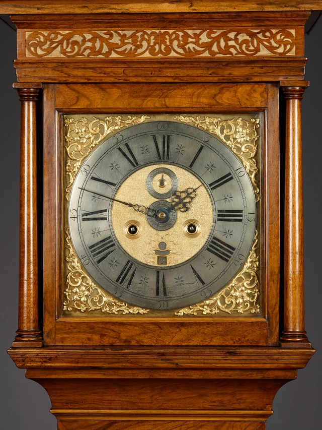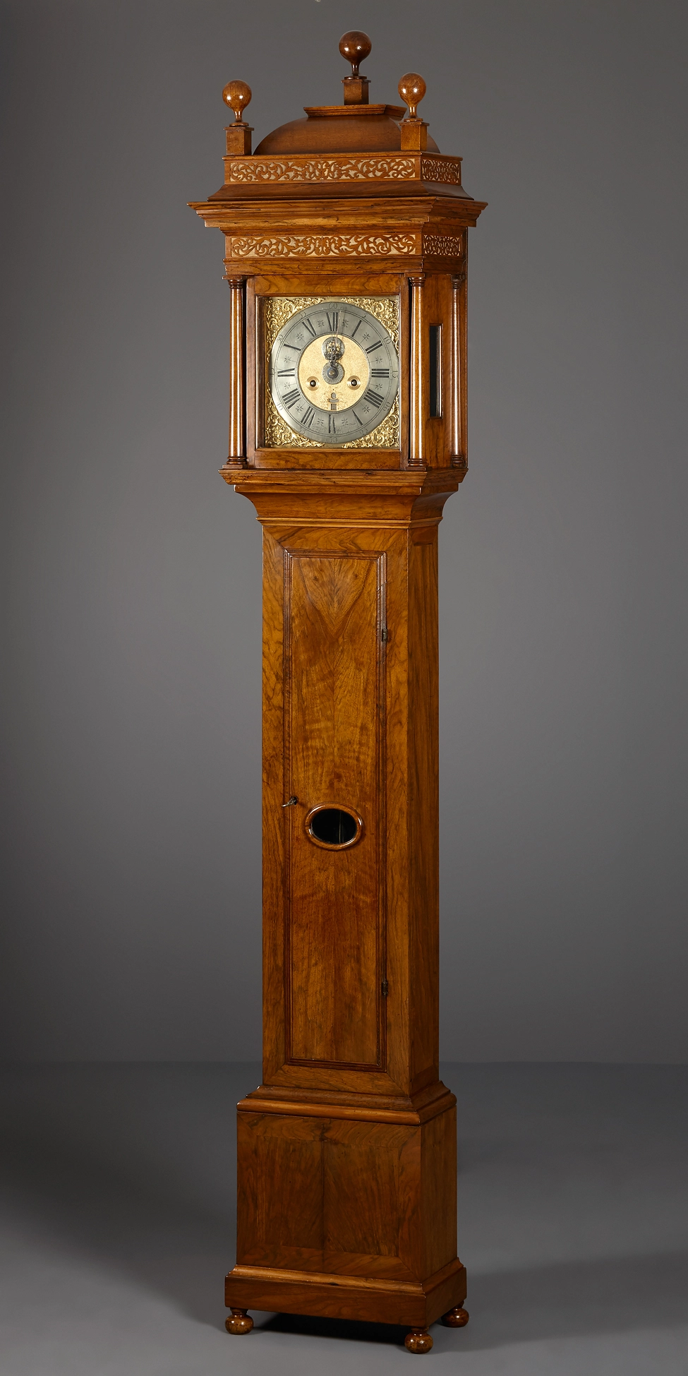 The oak case is entirely veneered with walnut and is supported on bun feet beneath the concave plinth. The pendulum case with a trunk door with oval lenticle. The dial is flanked on both sides by columns, giving the illusion that the frieze above is merely supported by the pilasters. Surmounted by a loose hood decorated with three wooden sphere finials.