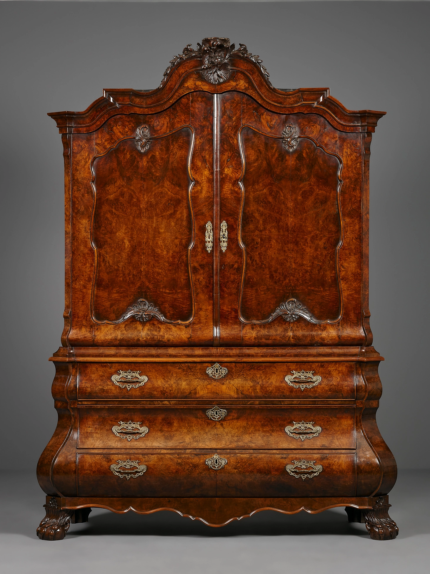 An elegant and relatively small walnut root cabinet with a double-curved base cabinet upon clawed feet. The upper cabinet features two doors with slightly recessed cartouche panels decorated above and below with elegant, sculpted rocailles. The undulating shape of the doors’ upper edges is emphasised by the pediment, which follows and reinforces their lines. The upper side of the pediment incorporates five plateaus for placement of a garniture set, and it is centrally decorated with an elaborate sculpted crest.