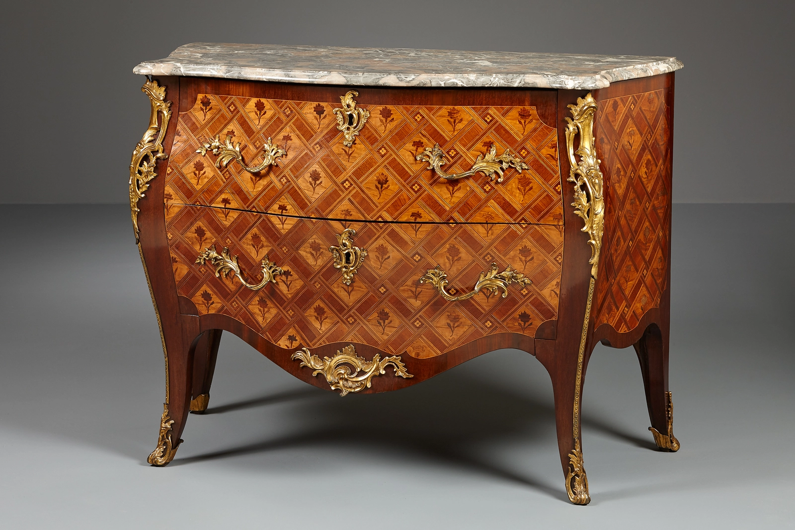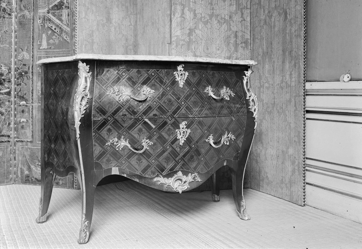 A bulged commode with two drawers over the full width. This type is also referred to as “commode sans traverse”, because the transverse support of the drawers is hidden behind the drawer fronts. The arched corner supports are decorated with gilt bronze fittings and sabots decorated with acanthus volutes and flower and leaf motifs. The fittings on the skirting, the drawer handles and the escutcheons are decorated with asymmetrical flower and leaf motifs and rocailles.