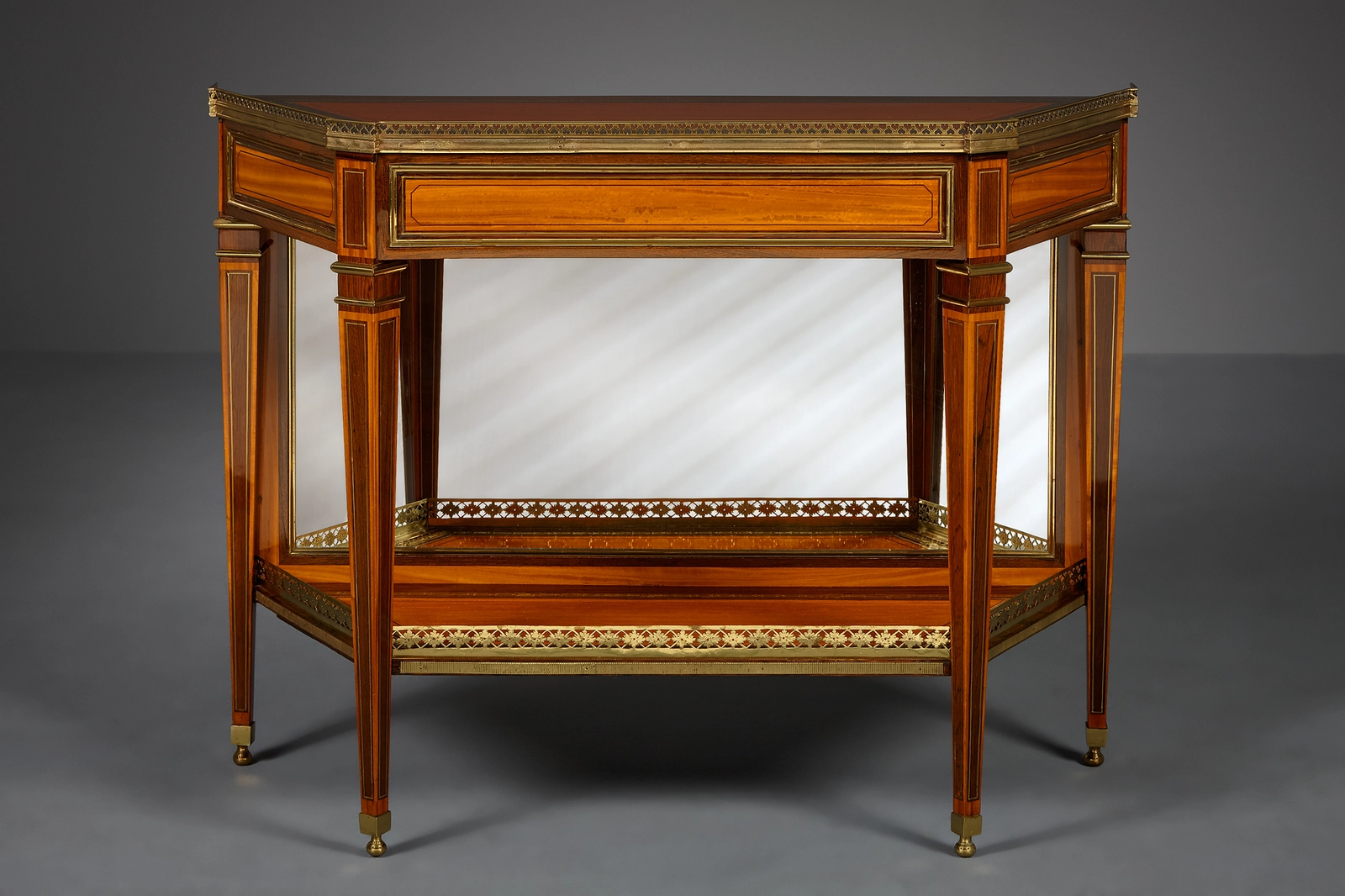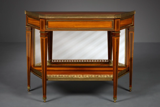 A very elegant ‘console desserte’ with a pierced brass gallery, above a mirrored back and tapering legs joined by an undertier. Veneered overall with a combination of satinwood and rosewood, trimmed with brass. The top’s gallery is formed by brass trimmings and a broader trimming of stylised tulips, a decor that is repeated on the tier below.