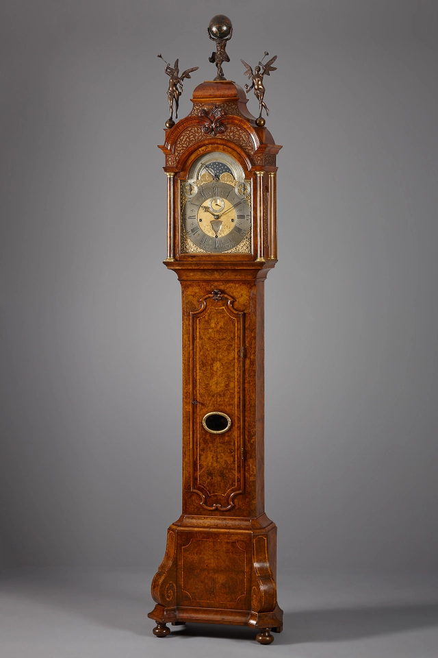 The front and sides of the case are entirely executed in walnut root veneer. The base has diagonally oriented knees upon ball feet. The central section features a door and an oval lenticle. The door giving access to the dial is flanked by two round pilasters with bronze capitals. Ornamental carvings decorate the sides flanking the movement and the crown of the bonnet. The crown has a carved crest and is topped with three gilt wooden statues: Atlas, flanked by winged buglers.