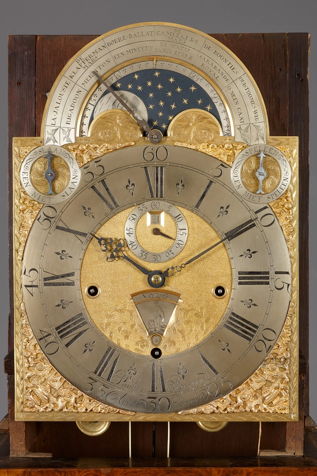 The dial with gilt centre and silvered engraved ring displays the hours in Roman numerals and the minutes in Arabic numerals. The numeral ring is flanked at the corners by gilt bronze openwork. Below the numeral XII is a seconds bit incorporating a date display. Above the numeral VI is a weekday display, and centrally placed within the lunette is a moon phase indicator. Above this, in an arc aligned with the lunette, is a listing of the twelve melodies. Two melodies can be chosen by means of an adjustable hand. To the left and right are two small rings with small dials by means of which the musical train and striking train can be engaged or disengaged. The clock is signed on the numeral ring: Paulus Bramer Amsterdam.