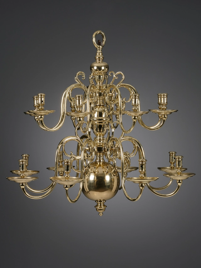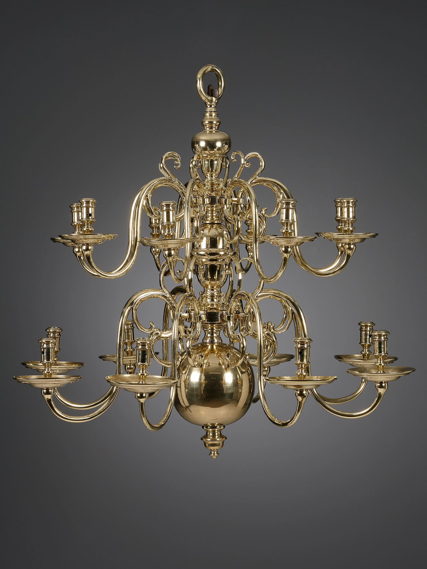 In the seventeenth century, the Low Countries witnessed the emergence of a new type of lighting: the cast brass ball chandelier, with an elaborately profiled column and a ball and finial at the bottom. The handsomely curved arms were attached in a circle around the column, in one or more layers.