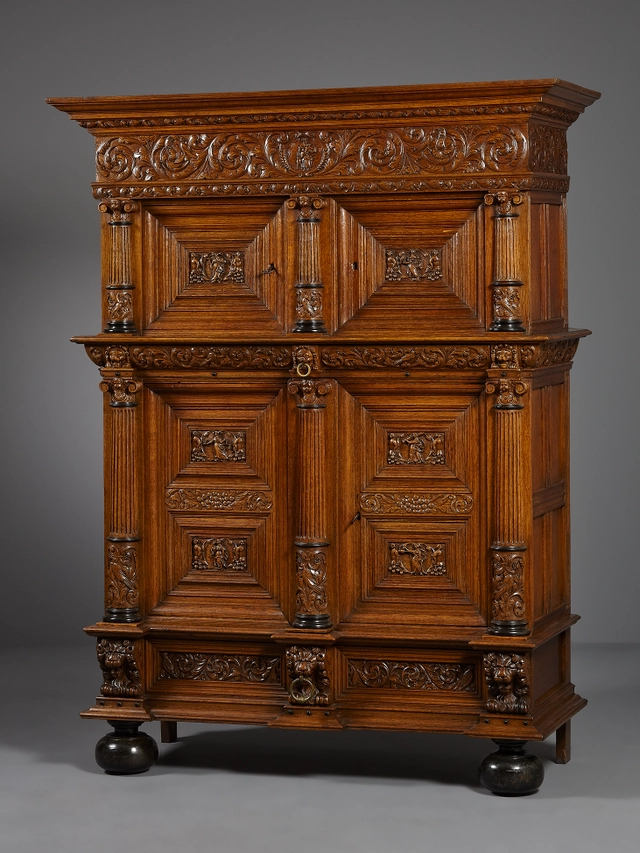 An oak column cupboard with four doors: two smaller doors in the upper cabinet and two larger doors with double centrally placed panels in the base cabinet. The cupboard consists of three sections, namely a base cabinet containing a drawer and two doors, an upper cabinet containing two smaller doors, and a separate pediment. The pediment incorporates a profiled cornice which protrudes significantly outwards. Below it is a tall, undivided frieze decorated with carvings of acanthus leaf scrollwork and birds. In the centre of the pediment is a stylised shield featuring one of the divine virtues, Love, in the form of a mother and her children.